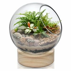 This 8.5 inches tall slant cut terrarium bowl with wood base is the newest addition to our large collection of plant terrariums. Angle cut opening circular vases are perfect for decoration in any room and setting. These novel vases call to mind of globular pea pods and one can make a cozy habitat for algae or succulent plants. This modern vase is endlessly versatile. As plant terrariums, this clear glass bowl offers designers the perfect and a one-of-a-kind plant art utilizing colored sand or pebbles as accents. The wood base is included and it brings a rustic, farmhouse feel to the decoration.