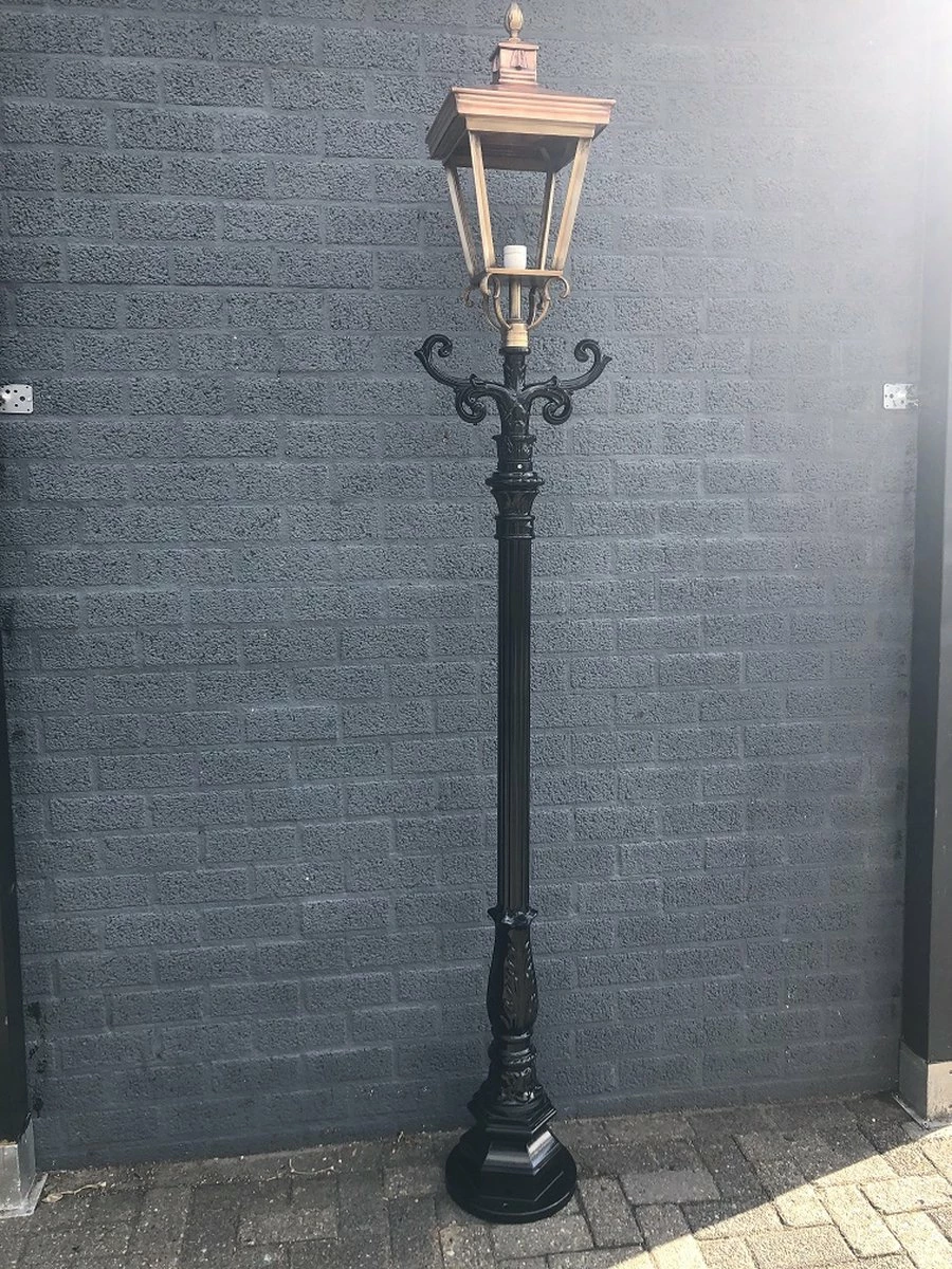 Contenu de la livraison : 1 lampe d’extérieur, lanterne Lily : mât, pièce de couplage, culot en céramique et verre, aluminium moulé sous pression noir, abat-jour carré en cuivre, hauteur totale environ 240 cm.