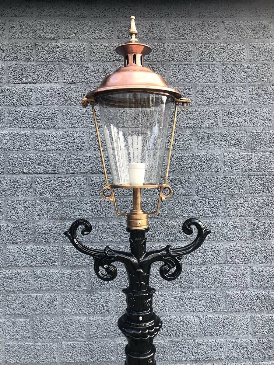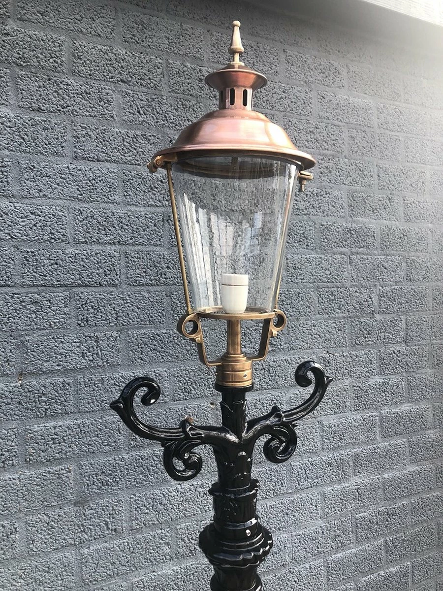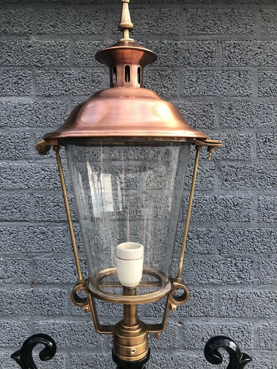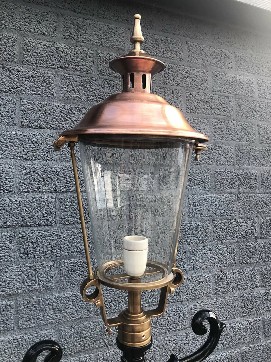 Une lampe nostalgie de bon goût pour votre jardin, lourde avec une grosse tête de lampe, tout cuivre-laiton, très belle !!.