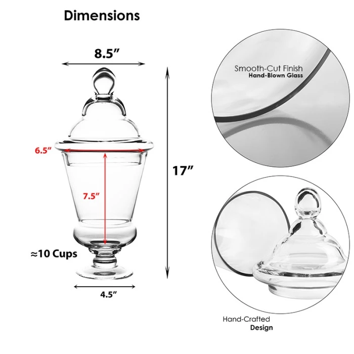 Functional high-end apothecary candy jars, perfect for all kinds of events such as wedding receptions, birthday parties, and anniversary celebrations. This particular shape is especially popular for wedding unity sand ceremonies and other religious ceremonial rituals. This chalice-like apothecary candy jar has a unique shape that works for every setting from bathroom and kitchen storage, to event decorating, candles, floral / terrarium displays and much more. A vintage style apothecary candy jar is excellent for candy buffet set-ups and dessert bars. Note: This item is hand-crafted by artisans overseas. When working with such delicate and thin material, factory perfection cannot be achieved, so imperfections may occur.