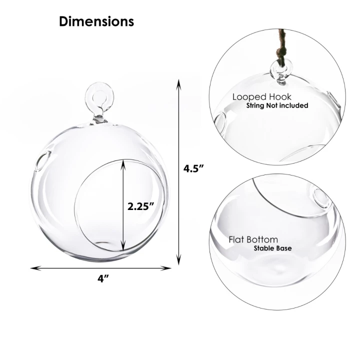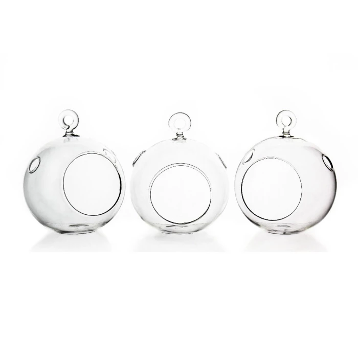 This beautiful glass tealight candle holder can anchor any outdoor or indoor event. Each glass orb comes with two small openings on its top for better air circulation. Suitable for creating your own special glass terrarium or insert flickering tea lights for a magical setting. Versatile in display, these glass holders can be hung using the glass ring or accessible to set on a tabletop with its flat bottom.