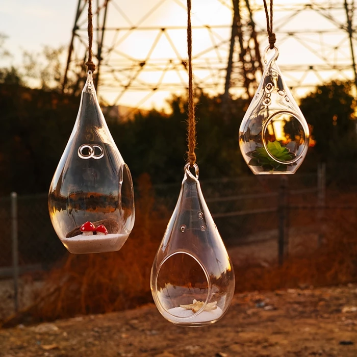 This beautiful teardrop glass candle holder with its unique shape can anchor any outdoor or indoor event. They are quite versatile and can be used as tealight holders or as terrariums, especially for housing air plants (Tillandsias). Each glass orb comes with small openings on its top for better air circulation. Versatile in display, these glass holders can be hung using the glass ring or accessible to set on a tabletop with its flat bottom.