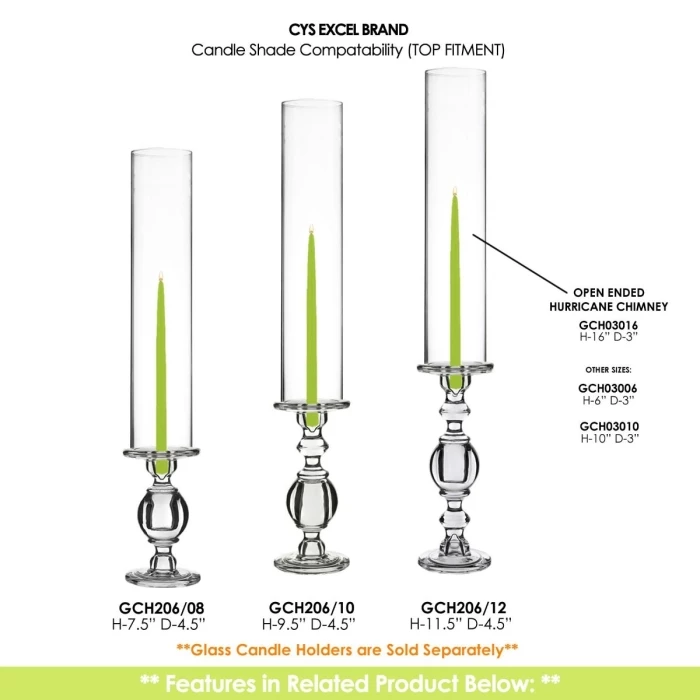 Our elegant open-ended glass hurricane shades are easy to place over candles and easy to remove, while still providing protection for open flames. The contemporary design of the hurricane candle holder gives an impressive display in your home and special events. It’s an astonishing bottomless cylindical shield to cover votive and short pillar candles for open flame candles. No more dripping wax onto the side of the glass.