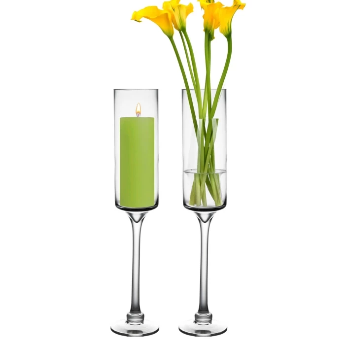 Total Height: 20″ | Opening: 3.5″ | Base: 4.5″ – This contemporary candle holder set is perfect for modern home decor. These candle holders are an elegant choice for scattering candlelight at any event! Their simple, clear design allows the candlelight to take center stage and set a romantic, warm ambiance. Great for the home in room of your choice. Group them together to make a dramatic statement at weddings, banquets, parties, and other gatherings. A must-have purchase for brides, event planners, caterers, restaurants, and other function of your choice.