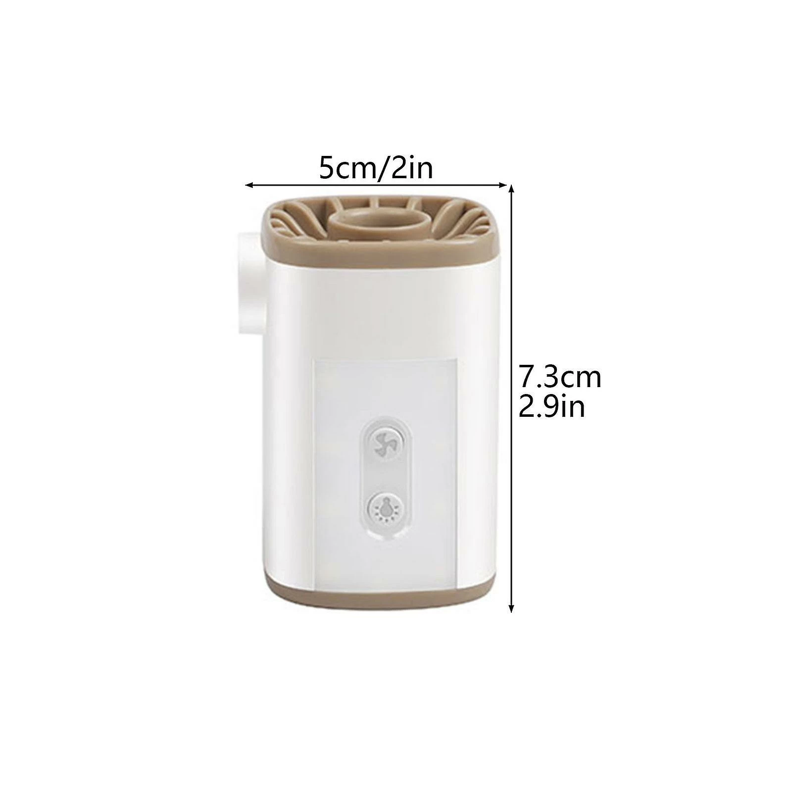Features 1. Ultra-Mini Size& Portable: Weight: 5.5oz; Size: 2 x 2 x 2.7inch; Portable air pump is mini as an egg and light-weighted. Portable to carry, this air mattress pump can be attached to the backpack or put in your pocket. One-button operation, widely used for outdoor camping, hiking, beach, and indoor storage bags. 2. Powerful& Quick Inflation: Designed with 2.5kPa air pressure and 650L/min wind speed, this air mattress pump can inflate air products within minutes. Besides, our tiny pump helps to make a fire with air-blow on outdoor camping or backyard barbecue. No more meaningless waiting. 3. Nozzles& Extensive Applicability: Micro air pump is equipped with different nozzles, which can fit most of inflatable air products, like air sleeping pads, air beds, air mattress, air toys, swimming rings, pool floats, air sofa, pool rafts, vacuum storage bags, etc. Install the suitable nozzle on the inflation or deflation port, then push up the switch to work. 4. Rechargeable Lithium Battery: Mini air pump with built-in large 3600mAh battery, works up to 45 minutes for one charging. The wireless air pump can be quickly recharged by power bank, laptop, car USB port when on outdoor or charged by power adapter at home. 5. Safety& Easy to Use: The exquisite crafts, boosted motor, and solid ABS plastic shell making this battery air pump sturdy, well-sealed, and durable. Please don’t use it continuously for more than 15 minutes until it cools down. Specification Material: ABS, PC Color: White Size: 5 x 5 x 7 cm Weight: 158 g Power output: 5 V Inflation Pressure (high gear): 4.8 KPa/0.7PSI Inflation Pressure (low gear): 2.5 KPa/0.36PSI Wind Speed: 650 L/min Working Time: 90 min/2.5 KPa, 65 min/4.8 KPa Continuous Lighting Time: 17 hours Battery Capacity: 3600 mAH/13.3 Wh Package Include: 1 Air Pump