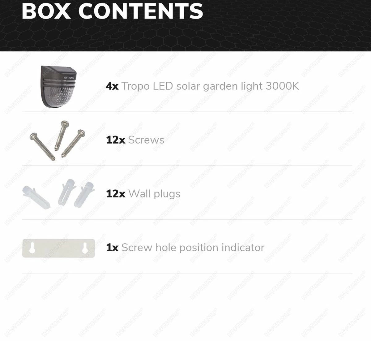 Illuminer facilement tout votre jardin et l’espace autour de votre maison ? C’est possible avec cet ensemble d’appliques solaires Tropo. Un ensemble de lampes d’extérieur pour tout votre jardin. Par exemple, placez deux lampes d’extérieur sur la clôture et deux sur votre façade et votre jardin sera magnifiquement illuminé le soir avec un effet de lumière unique. Vous n’avez rien à faire pour cela vous-même. Grâce à l’interrupteur crépusculaire intégré, les lampes détectent la nuit et s’allument.