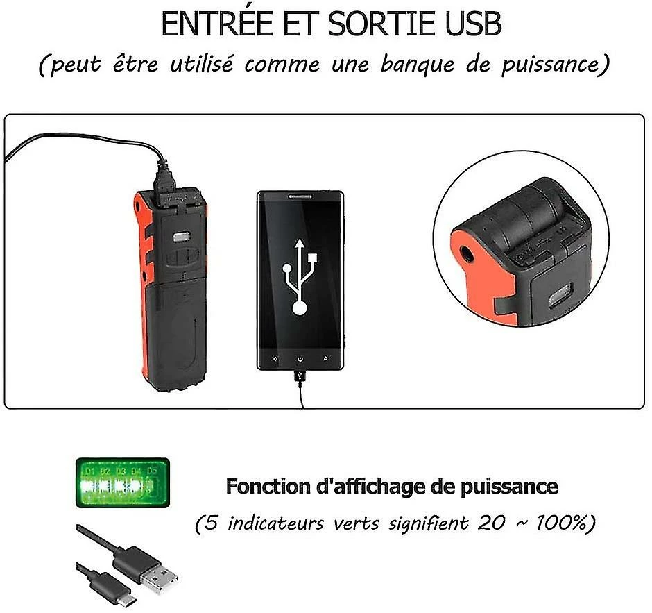 [Super Bright] -The light with 2 * 3W Led 240 lumens and 5W COB Led 400 lumens, Five green lights behind it which show the remaining power.[Durable Material] – The light is made of PC + TPR + Aluminum which effectively dissipates heat, extend the life of the lamp.[Smart design] Rotate -270 with magnetic base and hook that can illuminate multiple angles. Foldable design for easy transport and space saving.[USB Rechargeable] – 1 rechargeable 18650 battery built into Li-ion, rechargeable by USB port; There is an output port that can act as a power bank.[Wide Application] -It is ideal for car repair, emergencies, camping, travel, hiking, workshops, garages, power outages, home lighting, night work, etc.Gradual gradationThis task light has a dimmer switch that allows you to set the level of brightness you need. Five green lights on the back indicate the remaining power, with one lamp representing 20% of the electricity.RECHARGEABLEBesides, it can also be used as a power bank to recharge your phone in an emergency. A good choice for your versatile light.Characteristics:Product name: work lampMaterial: TPR + PC + ALUMINUMProduct size: 150x48x39mmUnit weight: 213.5gBulb type: 2 * 3W + 5W COB LEDBattery: built-in 18650 batteryBrightness: 400 lumensCharacteristics:* Progressive dimming (« » + « », « » – « ») at the rear.* Bright white LEDs for up to 400 lumens output.* The adjustable head can be tilted 270 .* Charge from any powered USB port.* Magnetic base* Power display on the back, 1 lamp represents 20% of the electricity.* The battery can be removed.Package List:1 COB flashlight (battery included)
