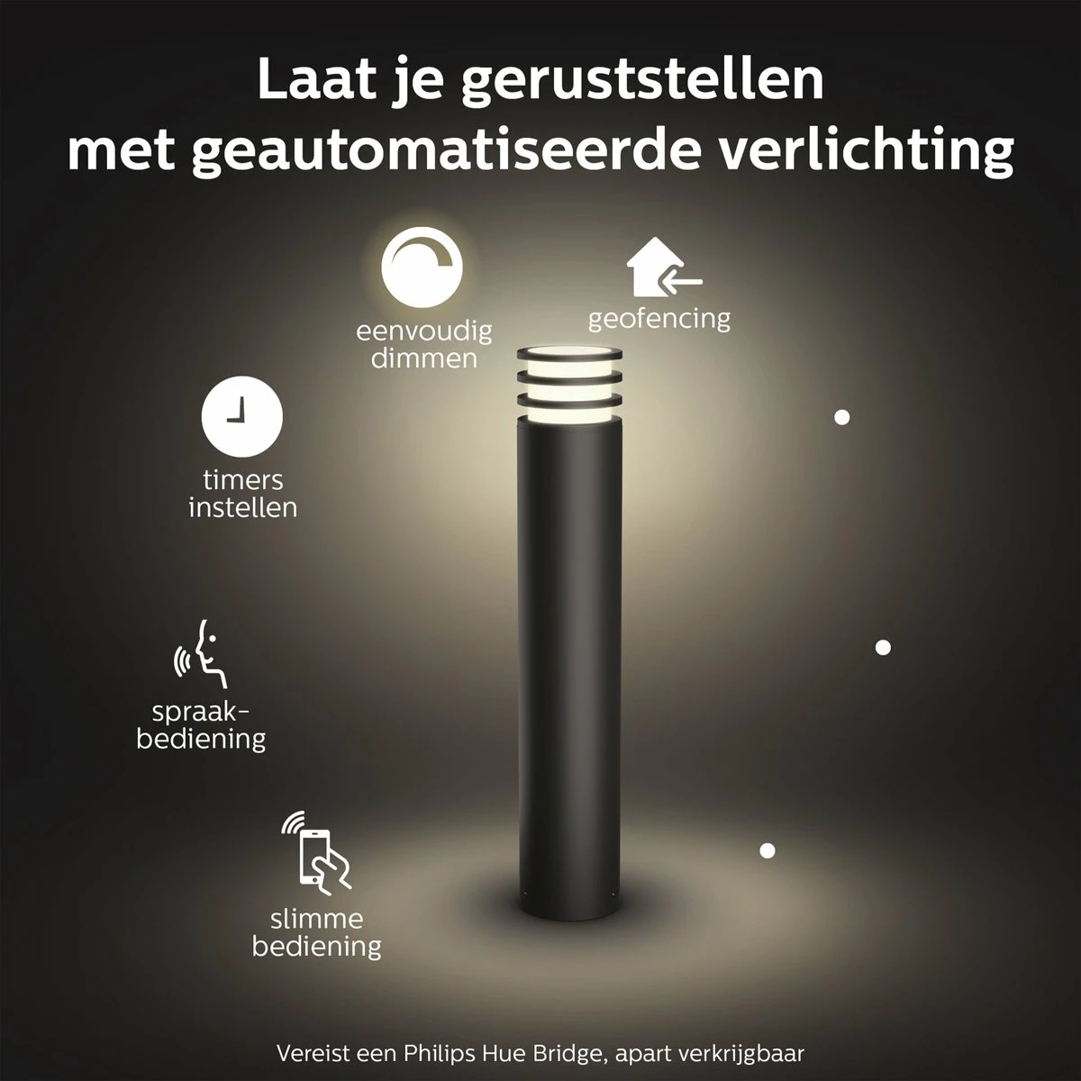 Profitez de longues soirées à l’extérieur, terminez le travail dans le jardin ou retirez les déchets après le coucher du soleil. Votre éclairage Philips Hue peut s’allumer automatiquement selon un horaire ou en fonction du lever et du coucher du soleil. Et bien sûr, vous pouvez aussi éteindre ou diminuer votre éclairage de cette manière. De cette façon, vous n’avez plus à vous soucier de l’allumage des lumières.