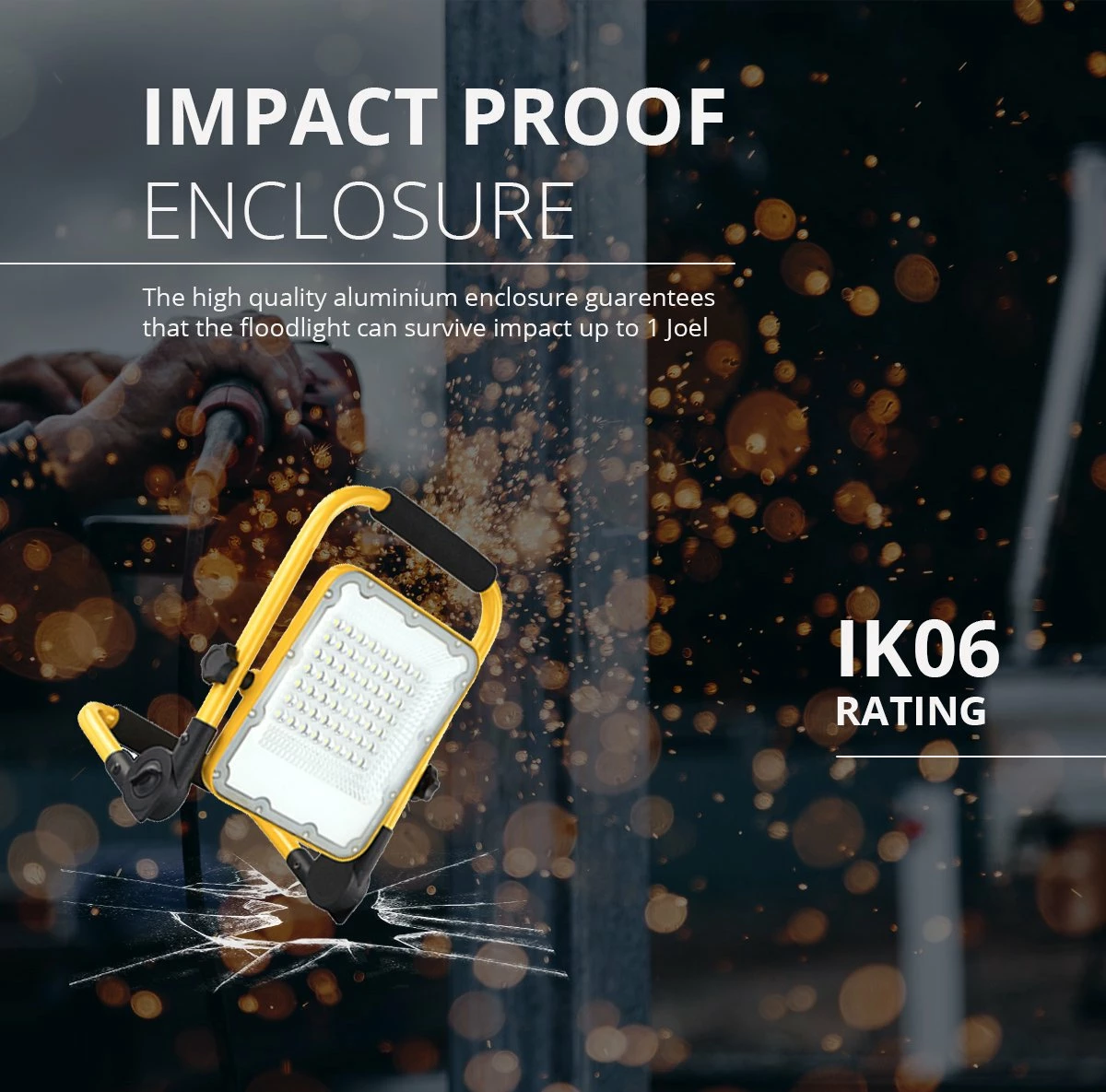 Les lampes de construction à batterie LED sont équipées de puces LED Lumileds de haute qualité qui fournissent un excellent rendement lumineux. Le CRI> 70Ra et produit de la lumière à la température de couleur 6400k. Avec une valeur IP de IP65, les lampes de chantier alimentées par batterie conviennent à une utilisation intérieure et extérieure. Les lampes de construction à LED ont une durée de vie de 25 000 heures de fonctionnement.