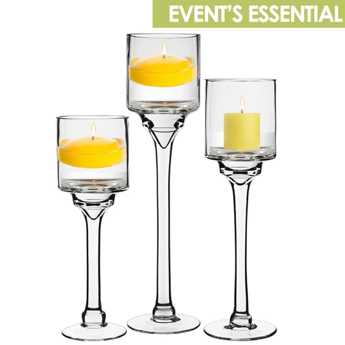 Long Stem Glass Candle Holder Set Of 3. H-12″/14″/16″ X D-4″ (Pack Of 6 Pcs)