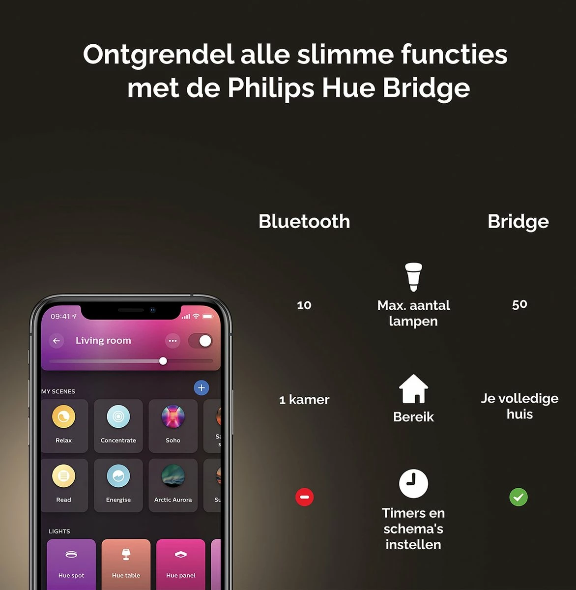 Ajoutez jusqu’à 10 lampes intelligentes et contrôlez-les facilement avec une seule touche dans l’application Hue sur votre smartphone ou tablette.