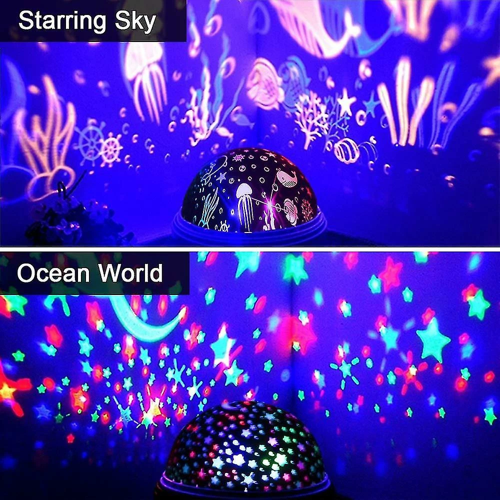 Enjoy Starry and Ocean World Projection Theme remove the cover to project a multicolored starry sky on the ceiling and walls of bedroom or living room. this lamp can also be a novelty toys for little toddlers boys and girls to develop their unlimited creativity and imagination. Let deep night no longer become a Monster in the minds of toddlers and babies, but a colorful dream.