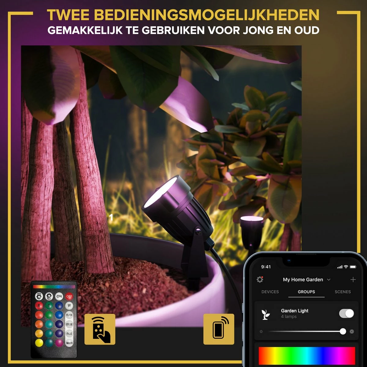 Voulez-vous pour impressionner vos amis et votre famille lors de votre prochaine fête ? Alors ce point de pointe est vraiment quelque chose pour vous ! Illuminez votre jardin d’une manière spéciale et faites ressortir vos plantes et vos fleurs magnifiquement la nuit. Ajustez l’éclairage selon votre humeur ou le thème de votre fête. Bien entendu, les lampes peuvent également être réglées sur une simple lumière blanche ou jaune chaud. Pour couronner le tout, vous pouvez synchroniser ces lumières avec votre musique préférée, afin d’obtenir un véritable spectacle de lumière dans votre jardin !