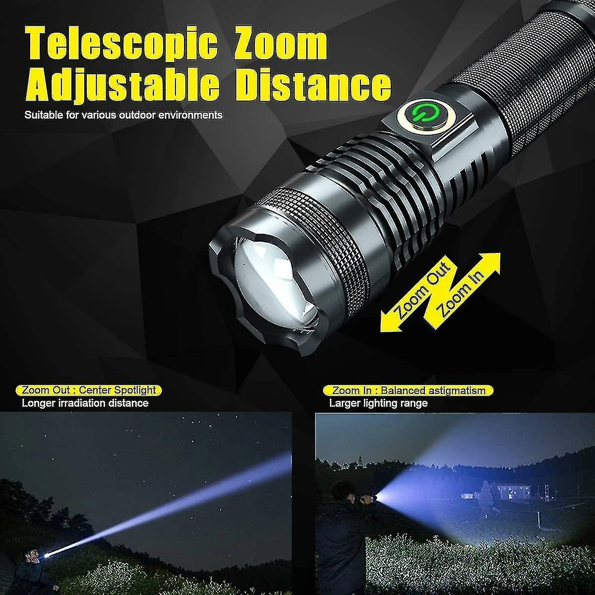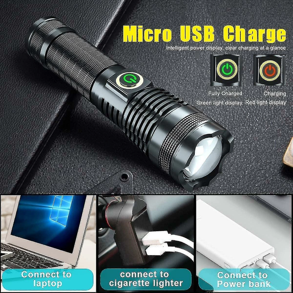 Lampe de poche super brillante – Notre lampe de poche de 5000 lumens utilise une puce LED XHP70 durable, fournit une lumière puissante, 4 fois plus lumineuse que la lampe de poche XML T6. Distance maximale du faisceau: jusqu’à 500 mètres. Durée de vie : jusqu’à 50 000 heures. Attention: vous devez le charger complètement avant utilisation, veuillez vous assurer que la batterie + est orientée vers l’intérieur. Rechargeable par USB et écran d’alimentation – Avec une batterie rechargeable 26650, il peut être chargé par câble USB (inclus), via batterie externe, ordinateur, chargeur de voiture, chargeur mural. Modes de faible luminosité pour 6 heures d’utilisation. Lorsqu’il fonctionne, l’indicateur d’alimentation au-dessus de la lampe de poche devient vert, lorsqu’il devient rouge, cela signifie qu’il reste 30% de batterie, vous devez le charger.5 Modes et zoom télescopique – A 5 modes différents: haut, moyen, bas, stroboscope, SOS. Changement de mode facile en appuyant doucement sur le bouton de commutation. Tirez sur la tête de la lampe de poche pour changer la distance focale. L’astigmatisme convient à l’éclairage de grandes surfaces. Lampe de poche adaptée à l’éclairage longue distance. Mini taille qui tient dans votre main ou votre poche, sac à dos, sac de survie ou boîte à gants de voiture. Imperméable à l’eau et durable – Le niveau d’étanchéité IPX65 protège contre les éclaboussures d’eau depuis n ‘ n’importe quel angle. Convient à l’environnement extérieur et aux conditions météorologiques défavorables. S’il vous plaît ne pas plonger dans l’eau pendant une longue période. Cette lampe de poche est faite d’alliage d’aluminium, antidérapante, résistante à l’abrasion, ce qui en fait un outil robuste pour frapper quelque chose en cas d’urgence.