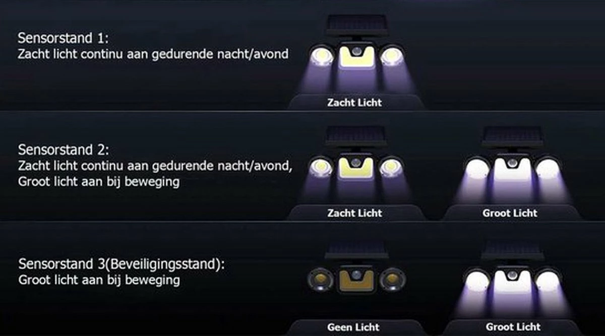 - Position 2 : les lampes brûlent doucement en continu et passent immédiatement à la luminosité élevée lorsqu’il y a du mouvement ;