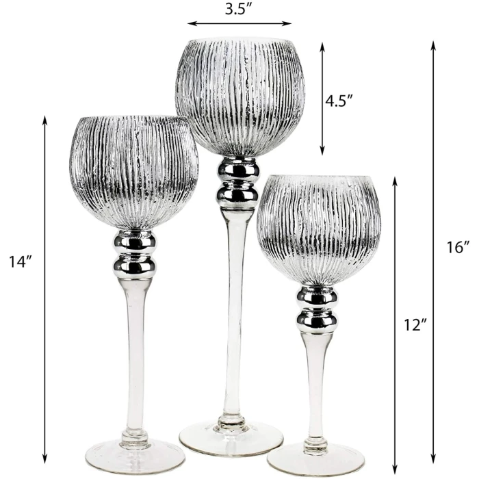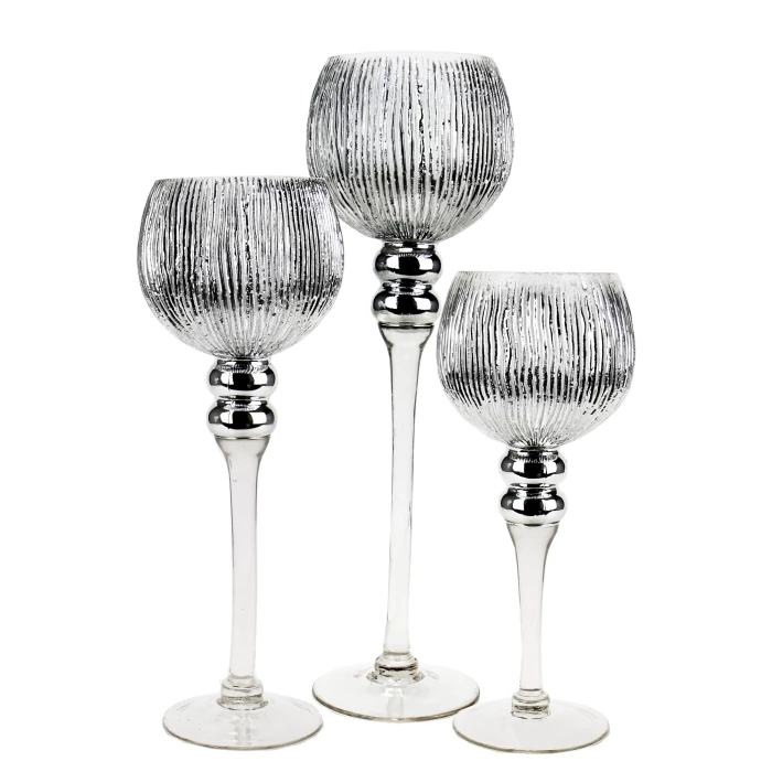 Three sets of 3 long stem candle holders for floating candles (Total of 9 pcs). The gorgeous etched finished design has its unique classic elegant look. The long stemmed silver glass design with numerous clear transparent etched clear stripes allows any candle color to gleam in its surroundings. A popular design for these elegant candle holders is to arrange an array of candles in varying heights for a dynamic layout.