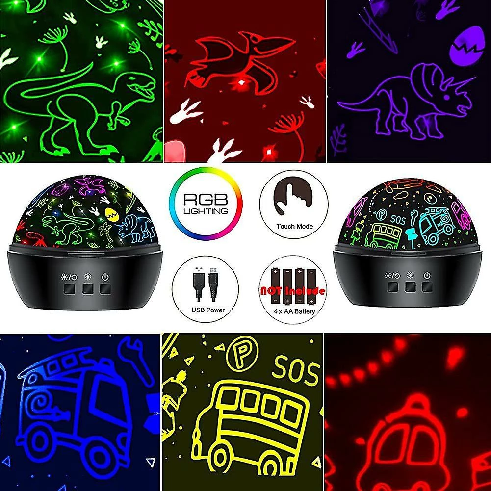VEILLEUSE MULTIFONCTION Cette veilleuse dinosaure n’est pas seulement une lampe de chevet, retirez le dôme, c’est aussi un projecteur de dinosaures pour les enfants. Il affiche une variété de mini-voiture et un monde fantastique de dinosaures sur le mur ou le plafond de la pièce dans toutes les directions. Il y a Triceratops, Pterosauria, T-Rex et plus de conception de forme, ce qui est une nouveauté et charmant. Entouré de dinosaures, créant une atmosphère de sommeil fantastique et artistique. Veilleuse pour les enfants de 3 ans 4 5 6 7 8 9.SLEEP KNIGHT FOR KIDSCré un monde de dinosaures fabuleux et réaliste, passez un meilleur moment avec vos enfants avant le coucher, une lumière confortable et douce. Cela n’irritera pas les yeux à la fois vous et les enfants. Le projecteur de dinosaure et de voiture peut non seulement détendre votre corps et votre esprit, mais aussi améliorer la qualité du sommeil, de sorte qu’il n’y a pas de monstres dans les rêves de votre enfant. C’est une veilleuse de sommeil chaud adaptée aux bébés et aux enfants âgés de 2 à 8 ans. Décoration de la chambre lumineuse pour garçons filles 3 4 5 6 7 8 9.MATÉRIAUX ÉCOLOGIQUESBe fabriqué en matériau écologique approuvé sûr, sans odeur irritante, sans bruit, forte résistance aux chocs. Puce LED de gradation IC de haute qualité, économe en énergie, longue durée de vie, lumière saine, pas de rayonnement. Les veilleuses dinosaures sont livrées avec une lumière brillante, douce, uniforme et sans scintillement, ce qui les rend à l’abri de vos enfants, leur apportant un bon sommeil. C’est une veilleuse pour enfants très humaine et pratique pour décorer la chambre d’enfant, le salon. MULTI MODEUNE variété de modes d’éclairage et de lumières magnifiques vous apportent une meilleure expérience visuelle. Accompagné de 8 sortes de couleurs merveilleuses. Vous pouvez choisir de pivoter ou non avec la rotation 360 conçue. 3 boutons pour toutes les opérations, Bouton Allumer/Éteindre : Allume la veilleuse blanche chaude. Mode d’éclairage du bouton: Modifie la couleur de la lumière (blanc chaud / bleu / vert / rouge). Rotation des boutons : contrôle la rotation du projecteur à 360°. Projecteur lumineux pour enfants. CADEAUX PARFAITS POUR LES ENFANTSLe projecteur de veilleuse dinosaure peut cultiver l’imagination des enfants. Ce n’est pas seulement un excellent cadeau pour les enfants âgés de 3 à 8 ans lors des anniversaires, des fêtes, de Pâques, de la journée des enfants, d’Halloween, de Thanksgiving, de Noël, mais c’est aussi un bon choix pour les amis et la famille pour décorer les fêtes. Ce n’est pas seulement une veilleuse, mais aussi un projecteur magique. Il peut vous emmener explorer le monde passionnant des dinosaures. Cadeaux de dinosaures pour 3 4 5 6 7 8 9 garçons de 10 ans filles