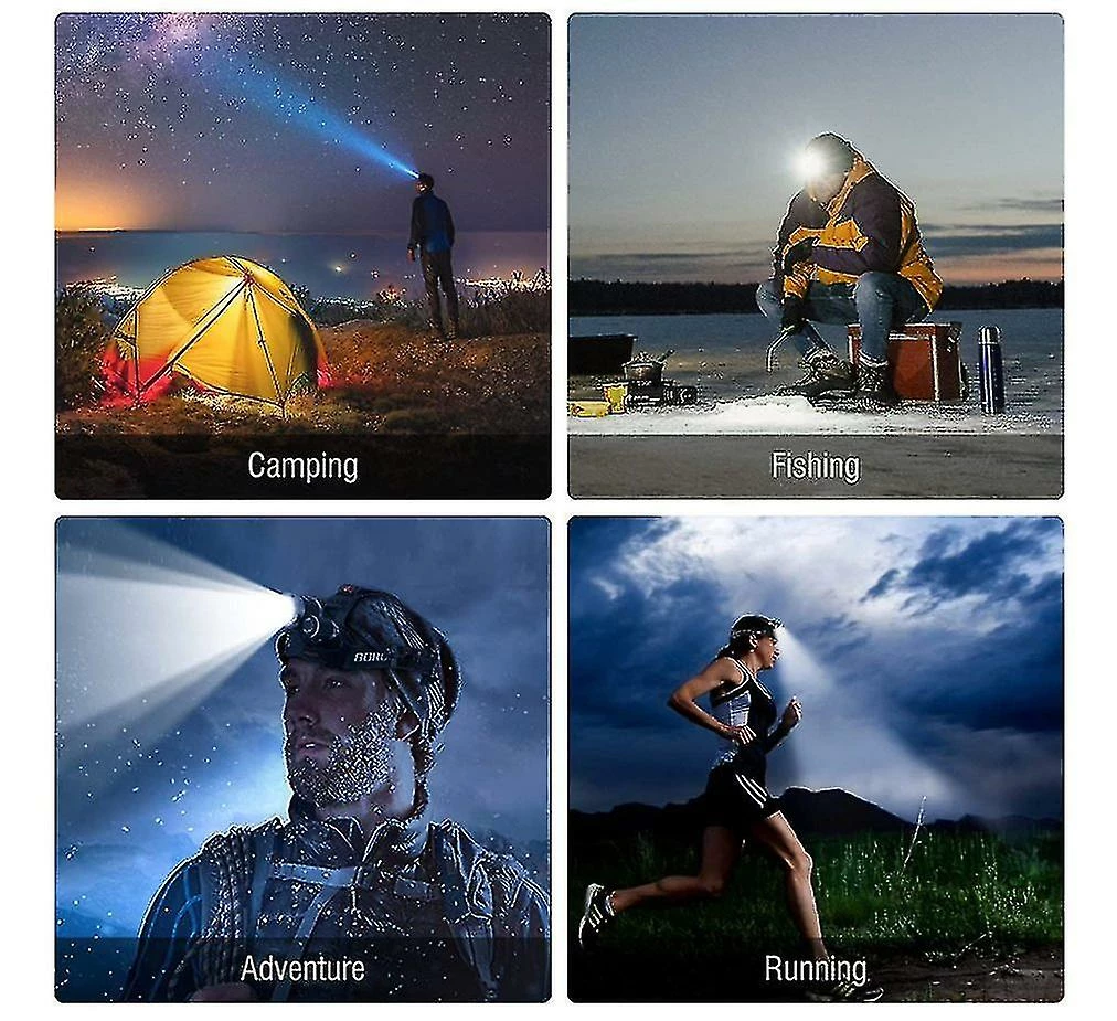 4 Modes and Extra Bright HeadlampsMax output up to 5000 lumens. Provide you with brightness for long-distance. 4 modes (high-middle-low-strobe) of the led head torch, you can choose the modes according to the surrounding environment.Ajustable 90 Degree and Waterproof Head TorchThe head lights is 90 degrees adjustable up and down and will stay steady after positioning. Up to 4-6 hours working time under full charge. IPX4 level waterproof headlight can run normally in the rain days. Please note that This flashlight can »t be a diving head lamp.WaterproofDurable and Adjustable HeadtorchHead Lamp is rated to IPX4. Impervious to rainfall, avoid submerging it in water. Made of aluminum alloy with hard surface treatment. The lamp and headband can be separated, facilitating multi-function use. such as a bike light and camping light and portable light.