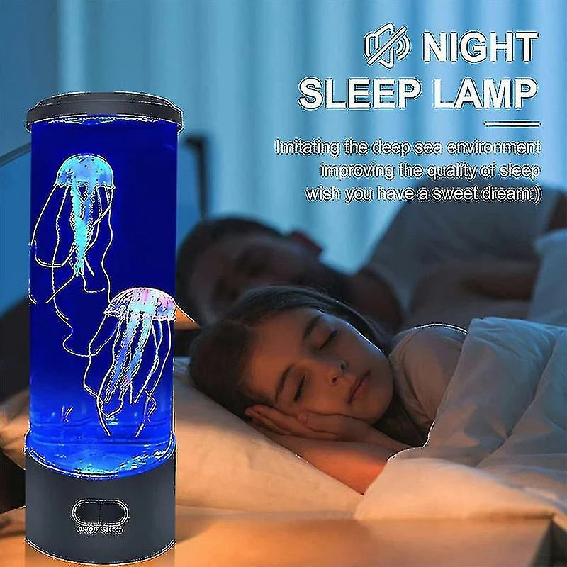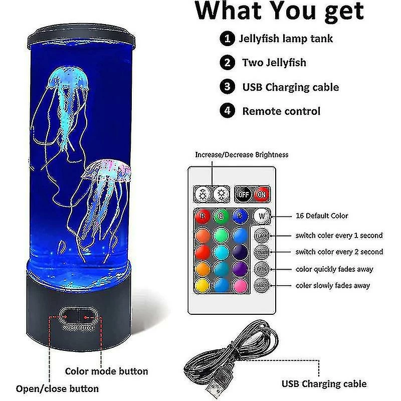 1.Load 3*AA battery or connect the power with USB wire. (Choose one way only,discharge the battery if you use USB wire)2.Put clear water inside the tank.(95% full is enough)3.Turn on switch on the base of the lamp.4.Add 3 drops of detergent into water and wait for about 1 minute to release the bubble from the tank.5.Dip the 2 jellyfish into water then they will float up and down(If there are some bubble under the head of jellyfish,use a stick to turn it over to release the bubble,or the jellyfish will keep floating on top)Note:Do not keep the lamp working more than 8 hours each day to save the life of motor.Change the water after about 2 weeks because the water may gone dirty.