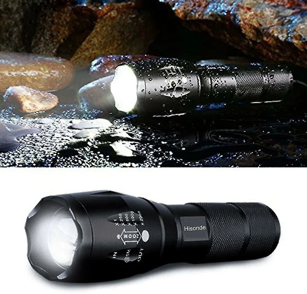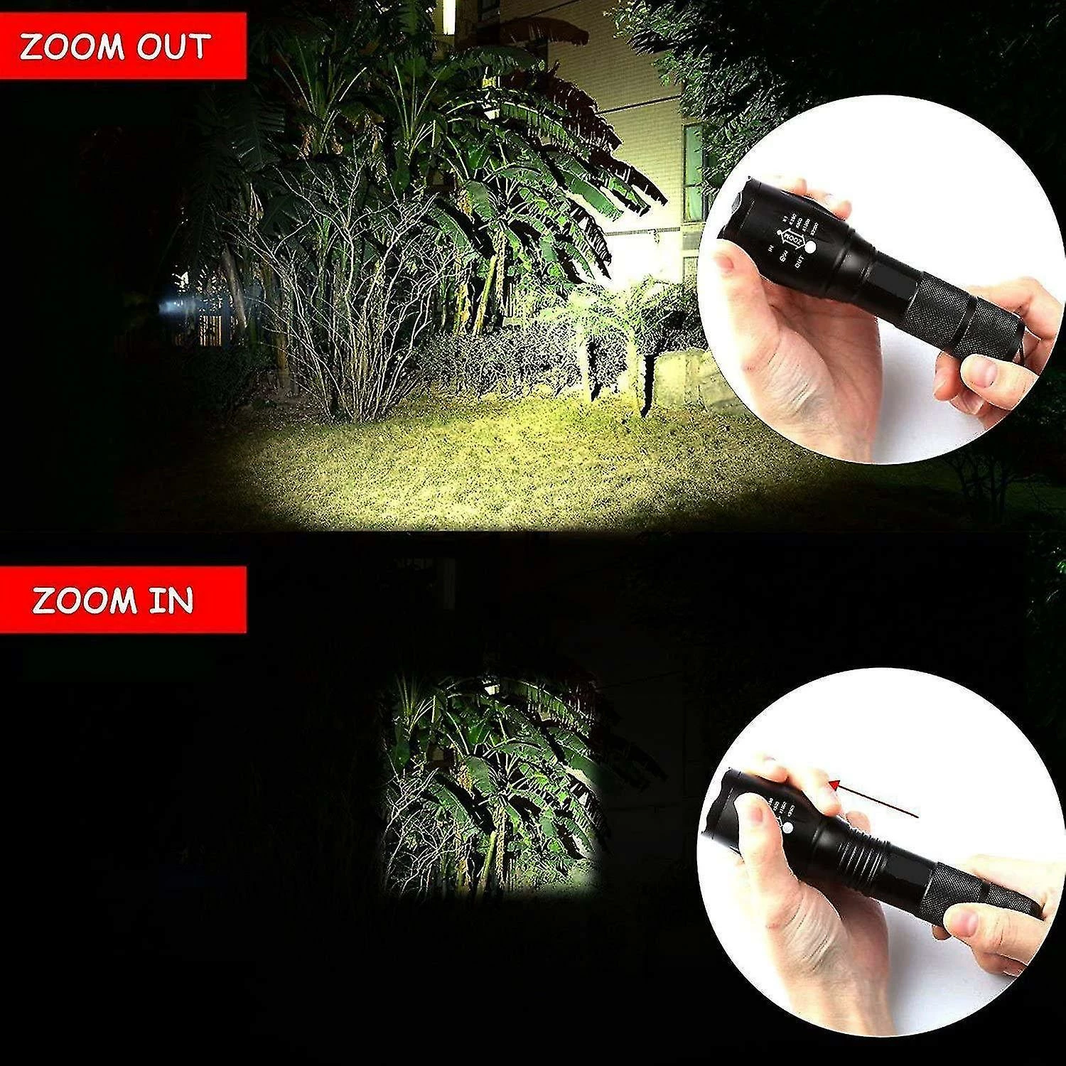 Ultra Bright LED Tactical Flashlights with 5 Modes and Zoom Function High Lumens Water Resistant Light For Hurricane,Outdoor Activities, Camping Accessories, Emergency1) Item was made of High-efficiency LED chip, 100,000 hours lifetime. Super Bright that can see 280 meters object.2) 5 mode outputs, , suitable for outdoor camping, hiking…etc.3) Adjustable focus range for different usage, stretching to adjust its focus.4) Durable aluminum alloy material and ultra clear convex lens.5) Safe and water resistant level of IPX-6. Works in heavy rain.6) Internal wiring applies the high efficient booster circuit, working voltage is wide and can utilize the batteries in the largest extent.7) Power by: 1*18650 3.7v rechargeable batteries (Not Included)oR 3xAAA(Not Included)Specification:1) One Set:4 Pack2) Special Features: LED Flashlight3) LED lifetime: 100,000 hours4) Switch type: Tail cap switch5) Meterial: Aluminium Alloy6) Size: 197x 35 x 25 mm7) Lighting Distance: 280m8) Net Weight: 6.0 oz (170g)9) Color: BlackPackage contents:4x 5-Modes FlashlightHow do you change the modes on this flashlight:1.Fully depress the on off switch completely twice within 3 seconds2.Just a light press to bounce the button