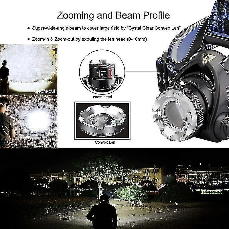 Pocketman 25000LM Headlamp T6/L2/V6 LED Headlight Zoomable Head Lamp Waterproof Head Torch USB DC Charging Head Light 18650|HeadlampsPocketman 25000LM Headlamp T6/L2/V6 LED Headlight Zoomable Head Lamp Waterproof Head Torch USB DC Charging Head Light 18650More than 98% of buyers will choose to buy a set with a battery and a charger to avoid some problems that are expensive and can’t be bought. High quality, full capacity, no virtual standard capacity. Recommend everyone to buy.LOOK AND FEEL GREAT WEARING IT – Super Comfortable and Stylish Head Straps are both Stretchy and Adjustable to Fit all Adults and Kids. With it’s Stylish and Sleek Design – All your friends and family will want to wear one.* Model of LED: T6* Lumens: 8000Lumens* Waterproofing design* Aluminum alloy casing* Aluminum alloy reflector* 3 switch Mode: Bright Light/Dim Light/Flashing Mode* Model of Battery required: 2×18650 Battery* Colour : Black with Blue Band* Head Light Weight :175g* Adjustable Focus, Zoomable LED Headlamp* Switch: head press switchMain Features:Use 1 or2*18650 rechargeable batteriesIntelligent circuit control, Telescopic Zoom,3 mode (strong, low, SOS)The headband can stretch adjust according to the size of your head. Conveniently put on or take off.The head It can adjust the illumination angle of 90 degrees.The red indicator light on the battery holder plays a good warning role in night walking or cyclingSuitable for sport lovers to do some such as hunting, cycling, Bicycle riding, To climb, Hike, Working, Fishing, Camping etcPackage Contains:1x LED Headlight + 2x 18650 Rechargeable Batteries + 1x DC Charger(We will match the correct charger specifications for you)