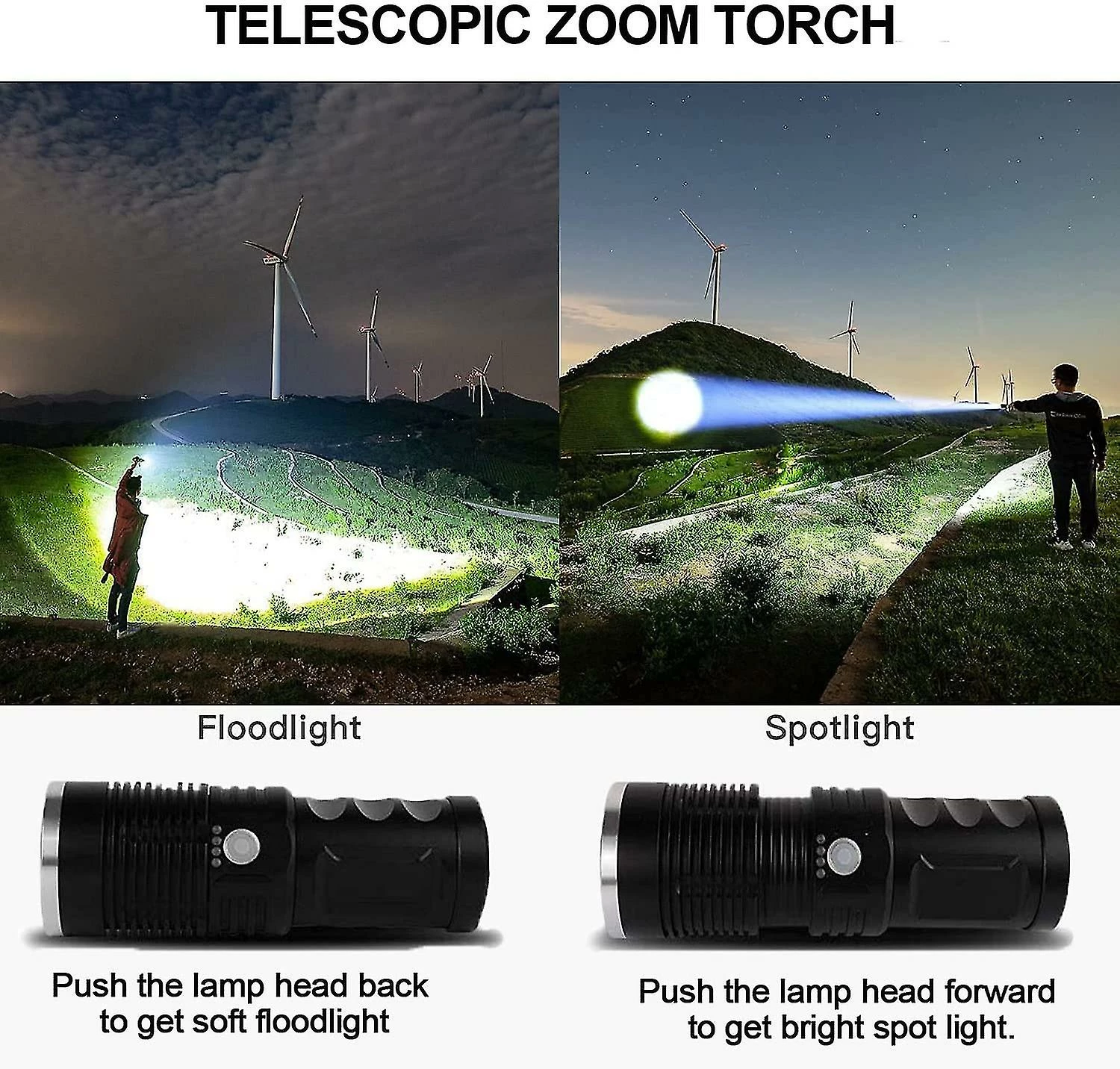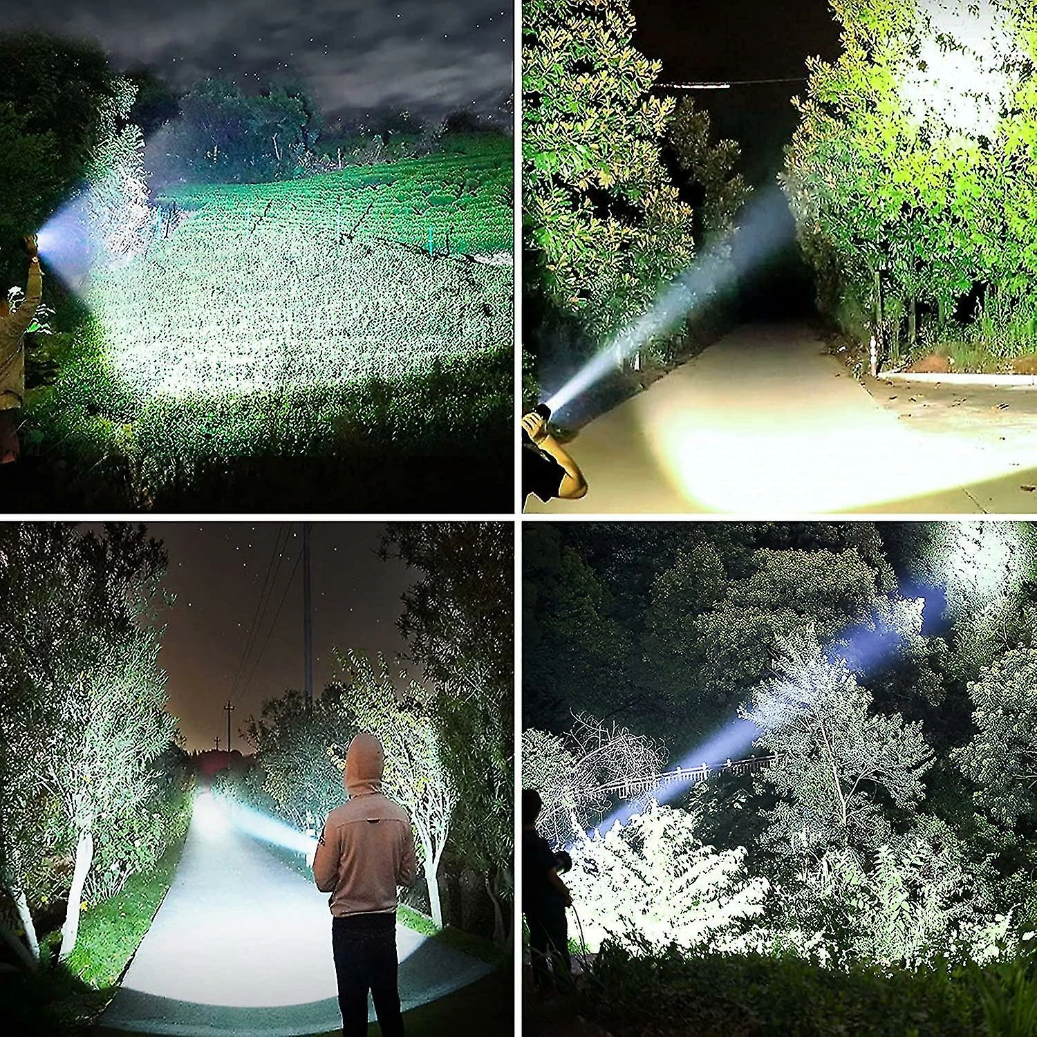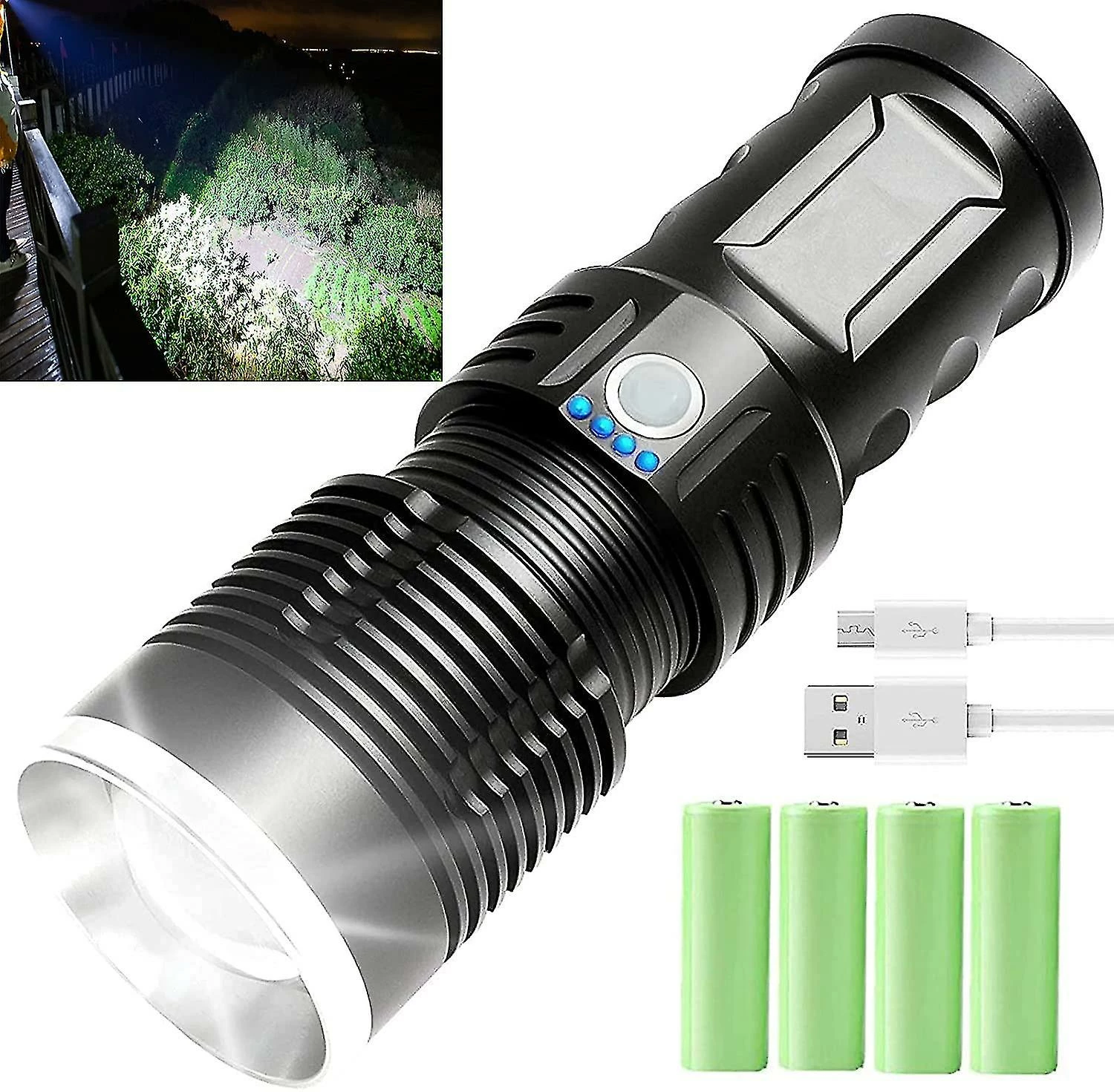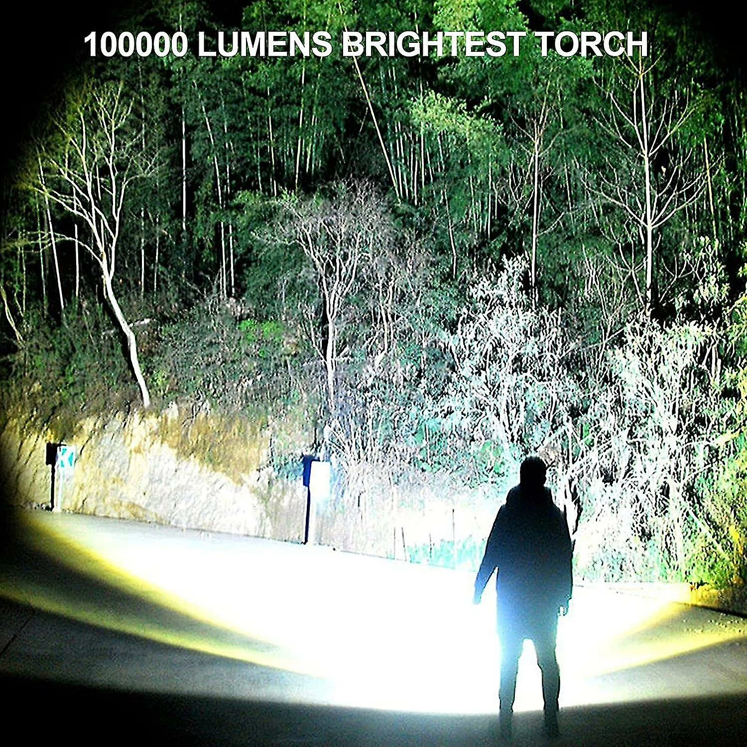 100000 LUMENS SUPER BRIGHT FLASHLIGHT — Tactical flashlight built-in advanced light chip, stable and bright light, always provide you with a bright light world. 100000 lumens, 8000K daylight can clearly illuminate the things within 1650ft, enables you to use it as a long distance tactical flashlight. Try it and you will love it.3 MODES & IPX5 WATERPROOF — High lumens flashlights are equipped with three lighting modes: Medium brightness, High brightness and SOS. In addition, the IPX5 grade waterproof tactical flashlight can be used normally in any bad weather such as rain or snow.11000mAh RECHARGEABLE BATTERY & POWER DISPLAY — USB rechargeable flashlight is powered by 4*18650 rechargeable lithium batteries, the capacity of each battery is up to 2750mAh, and the total reaches 11000mAh that can give you up to 10 hours of light on medium. In addition, our tp360 pro tactical flashlight adds power display function, so that you can see the power at a glance, and no longer have to guess the remaining power of the flashlight.ZOOMABLE & BETTER GRIP FEELING — Bright flashlight can emit large area floodlights and focused spotlights. You can get the required spot beam and flood beam by stretching the flashlight to adjust the focal length. In addition, we have upgraded the appearance of the newest flashlight. The length is 7.1in, the width is 2.1in, and there is a non-slip texture. The longer and thicker flashlight gives you a great grip feeling.