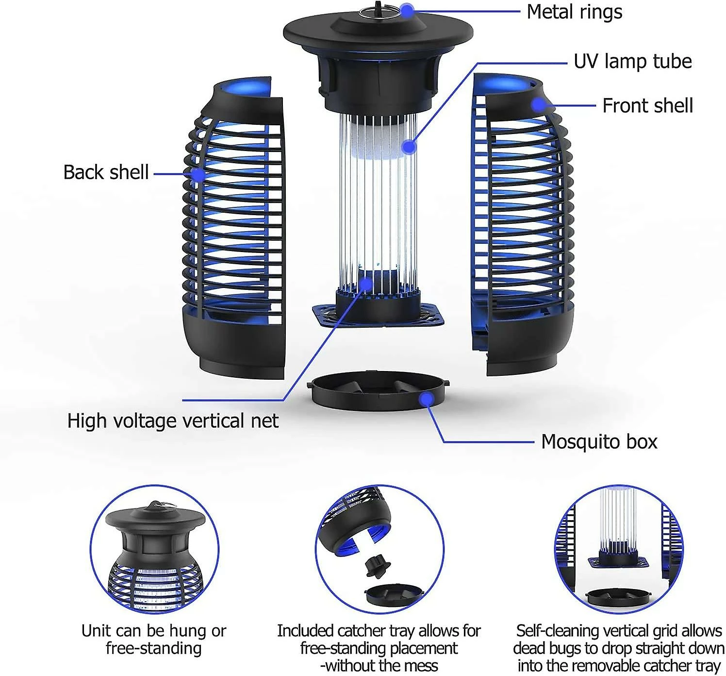 Sans l’utilisation de pesticides contenant des substances toxiques nocives pour l’homme, nos tueurs de moustiques électriques avec ampoule de 15 W attirent les insectes volants sensibles à la lumière avec leur lumière ultraviolette de haute intensité while_x000D_by volant dans la lumière et les tuer immédiatement avec un réseau haute tension 3000V. Il est inoffensif pour les humains, les animaux domestiques et l’environnement.
