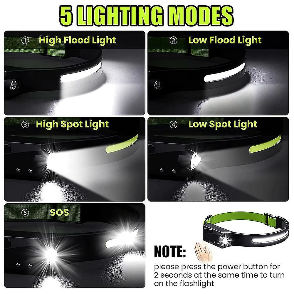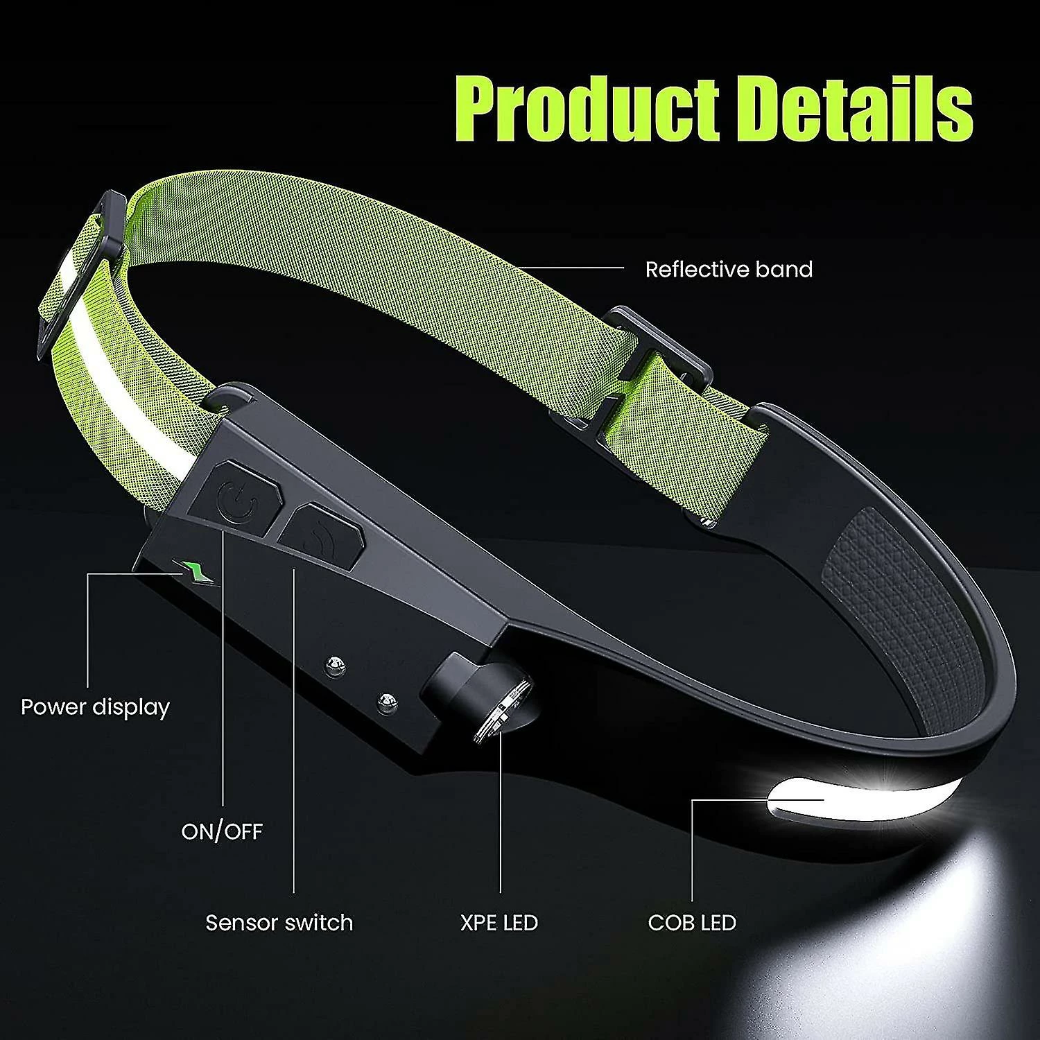 [Super bright effect & Multiple modes]: The LED Head Light Lamp lights up your surroundings, unlike any traditional head torch. The wide area COB light 230degree eliminates the need to move your head to illuminate the desired area. and the head torch has 5 light modes of brightness: COB High/COB Low/XPE High/XPE Low/COB & XPE strobe.[Usb rechargeable Head Light Lamp & Motion sensor modes]: This head torch is charged using a USB charging cable and you can charge from multiple USB devices, When fully charged, the headlight can run for up to 8 hours under low floodlights and up to 3 hours under high spotlights. The head torch also has a unique sensor function design, just wave your hand in front of the head torch to turn it on/off.[Lightweight & IPX4 waterproof]: you can feel the head without pressure, you will feel very relaxed. waterproof can protect your head torch from all angles of splashing, you Don’t worry about rain.[High-visibility reflective & Adjustable]: led head torch uses a green adjustable reflective strap, which is high-visibility reflective. The easy-to-adjust elastic headband fits easily and comfortably to multiple sizes, whether it is a child or an adult. The durable elastic headband gives you free hands, this light is perfect for long-time use.[Best gift & perfect choice]: This is your perfect gift for your family and friends, This head torch is perfect for adults and children, for dog walking, night reading, night fishing, hunting, jogging, camping, hiking, caving, climbing.Colour:greenMaterial:Silica gelPackage Contents:1 x Headlight1 x usb CableOnly the above package content, other products are not included.Note: Light and different displays may cause the color of the item in the picture a little different from the real thing. The measurement allowed error is +/- 1-3cm.