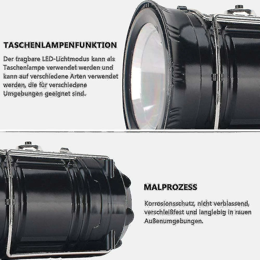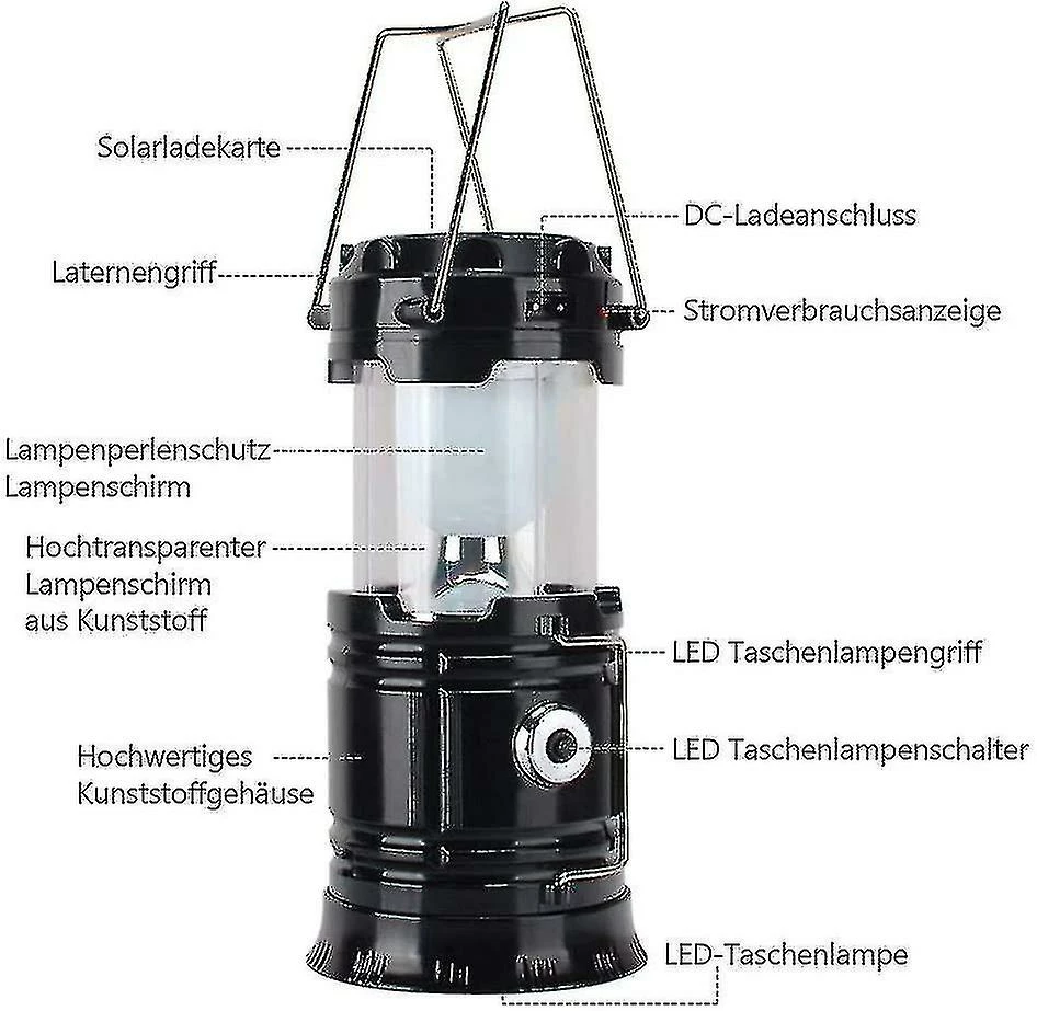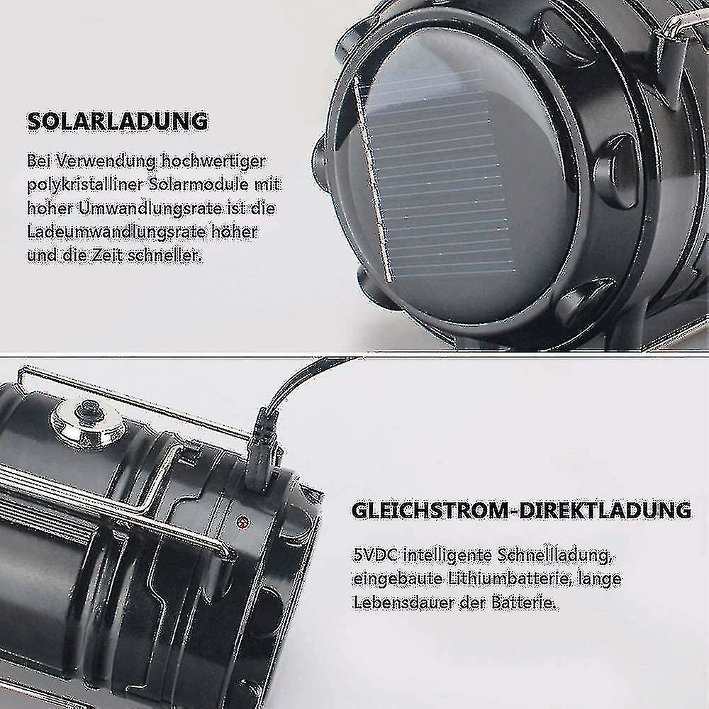 Two charging modes: Built-in large capacity lithium battery, long life, support solar charging and USB direct charging.It can also be used as a backup battery with which you can load your iPhone, Android smartphone and tablets.Two lighting modes: camping light mode, 360 LED lighting without blind spot, fixed and hanging lighting, suitable for multi-directional tent lighting.Lantern burner mode: the flashlight can be illuminated at the bottom and the light can be rotated.Turn off the switch that is suitable for adventure, biking and night hiking lightingConvenient Folding Design: Advanced folding technology, just pull out the camping lantern, start the lighting function.The exceptional structure makes our lanterns light and compact, perfect camping accessories.The hull is made of ABS with high resistance to corrosion and drops and everyday waterproof, IPX66.Suitable for multiple scenarios: Suitable for all weather conditions, such as light rain or snow.Ideal for outdoor trips, hiking, camping, fishing, car maintenance or preparedness in case power failure.It also serves as a flashlight.Ultra Bright Multifunction LED Solar Lantern Product Description: Charging: built-in large capacity lithium battery, charging cable, charging time should not exceed 6 hours.The ABS rubber body is waterproof and impact resistant.The waterproofing can be IPX66.Support solar charging and direct USB charging.It can also be used as a backup battery and allows you to recharge your iPhone, smartphone and Android tablet.Foldable design.To turn on the light, pull up and press back to turn it off.The brightness can be adjusted by pulling the lantern upwards.Very easy to use.With the ability to stand, hang, hang it and fix it on almost everything.Hang the lantern or in your tent with the folding handles or have your hands free when exploring the hiking trails.Technical characteristics: Dimensions: 135 x 90 mm Weight: 350 g.Voltage: 3.7 V.Material: ABS.Waterproofing: IPX66.Notes: Do not put the lantern under water or in any liquid.
