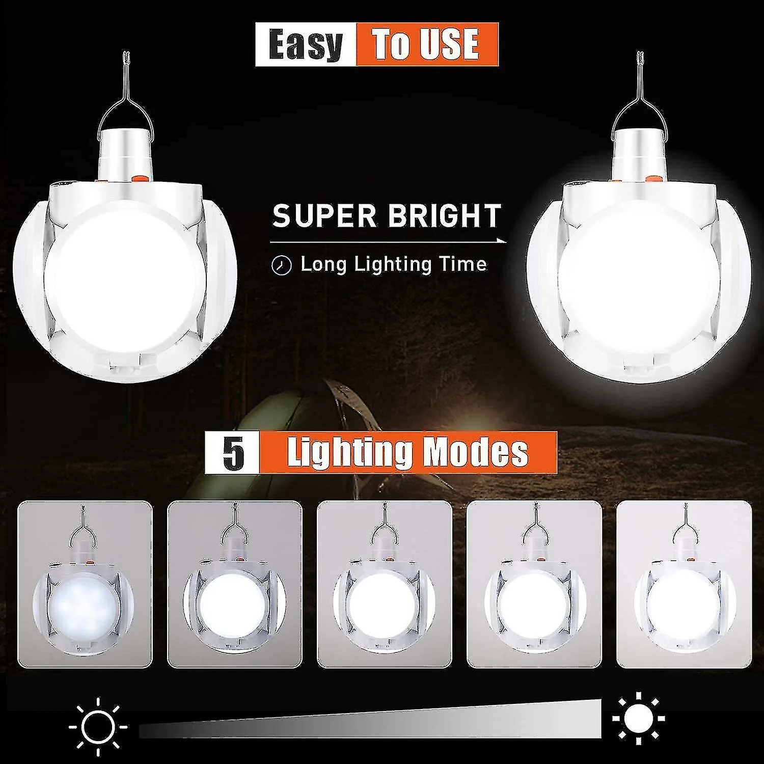 [5 modes de luminosité]: La lampe de tente LED dispose de 5 modes différents: économie d’énergie, faible, éblouissement, stroboscope et SOS pour les urgences. Délivrant un lumens de 2500 lumens en mode éblouissement, un éclairage doux pour la protection des yeux.