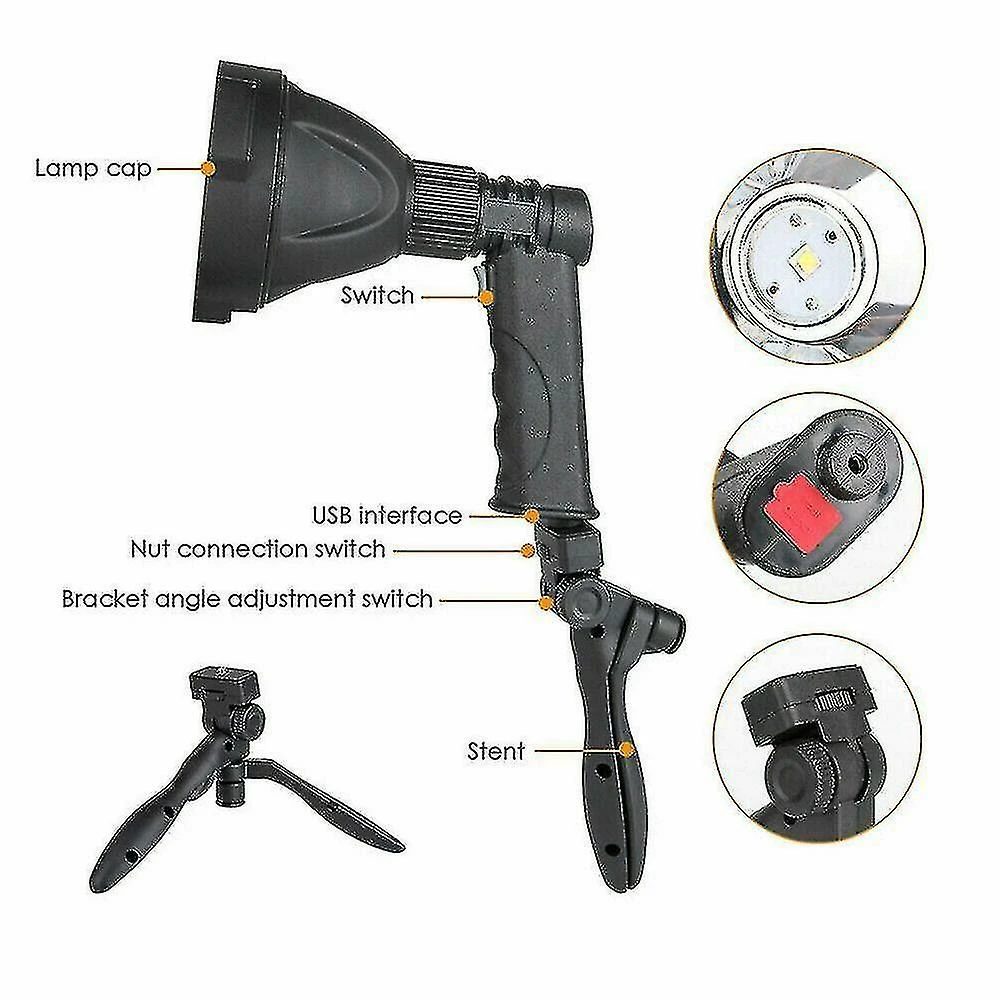 LED Hand held Spotlight USB Rechargeable Camping Hunting Flashlight Torch LampThe product is shipped based on the color or size of the main image of the product page.Specification:Material: PVCLamp beads: XML-L2Power connector: USB charging portBattery: Built-in lithium battery (4000 mah)Brightness(approx.): 2000 lumenPower: 10WWeight: 460 grams (including battery)Packing size: 20*20*12cmFeatures:Super bright XML-L2 LED bulb, the life span is up to 100 millions hours.The run time is up to 6-10 hours.Strong-low-flash three models, you can choose suitable model as necessary.Built-in rechargeable battery, no need to replace.With USB port, so it can also be used as power bank besides lighting device.After installing folding triangle bracket, you can change illumination directions by rotating bracket.Package included:1 x Hand-held spotlight1 x Folding triangle bracket1 x USB cable