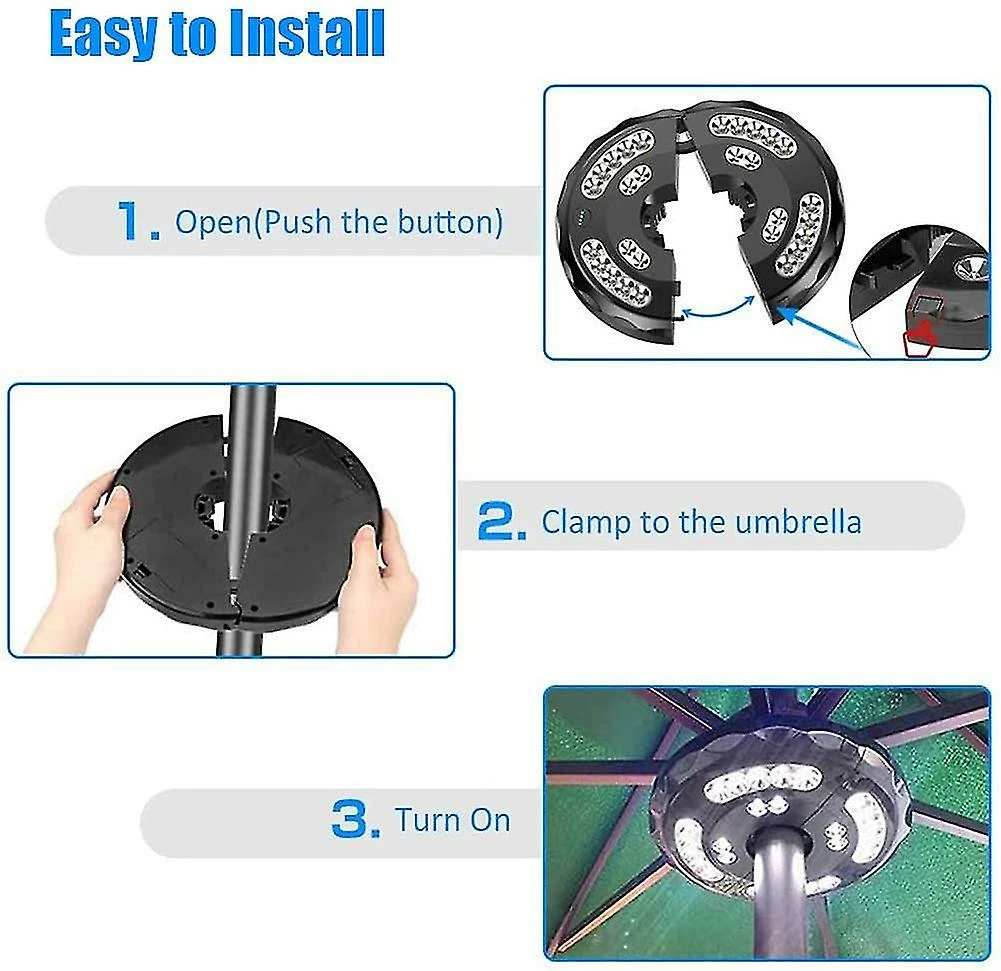 Facile à utiliser: Les lumières de parasol de patio sont faciles à installer, aucun outil supplémentaire n’est nécessaire, et le clip fort réglable automatique intégré est facile à serrer sur le parasol
