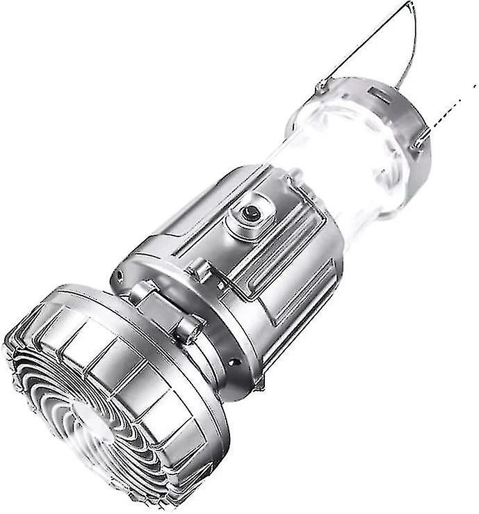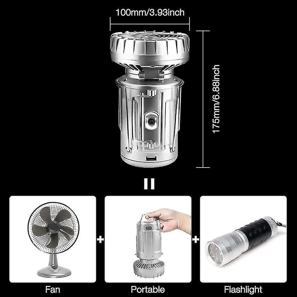 Waterproof Camping LightsSolar LED camping lights are splash proof, so they are perfect for all applications, ideal for work, camping, picnics, balconies, patios, the bike,mountaineering and outdoors. Other outdoor activities and auxiliary or emergency lighting.Lightweight HangingSmall and lightweight (10cm17cm), this portable solar LED camping light is easy to carry. Whether you are camping, hiking, exploring. Solar LED camping lights are essential camping gadgetsMultifunctionalThe solar LED camping light is a multifunctional portable camping light suitable for outdoor use. Not only has the lighting function, but also is equipped with a fan, which can be usedfor multiple purposes. The product comes with hooks and handles for easy carrying and hanging.Power modeThe LED solar camping light can be connected to solar charging and charging, or use 3 AA batteries (not included). The built-in battery capacity of the LED camping light is 800 mAh.Perfect Gift ChoiceFoldable design and easy handling make this rechargeable LED camping light with hook perfect for camping, hiking, night trips, fishing, power outages. camping lampsLED solar lights are ideal gifts for family, friends or camping enthusiasts.
