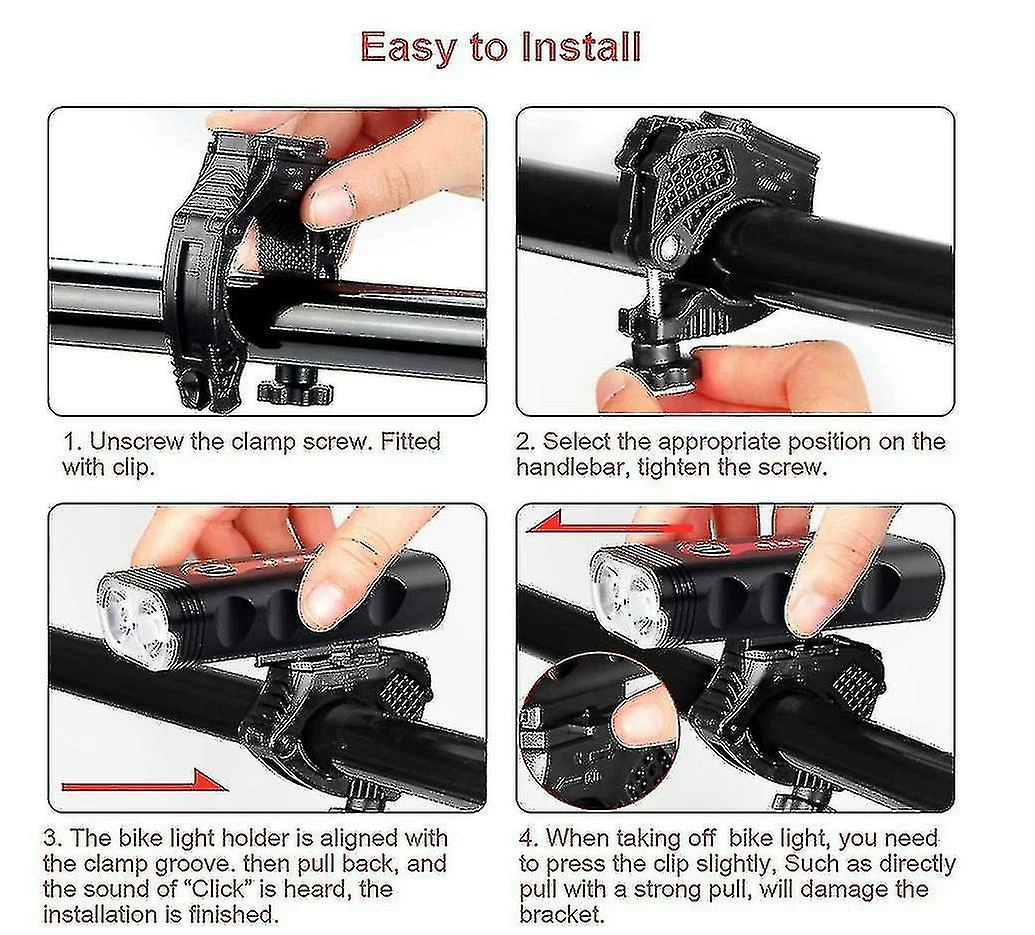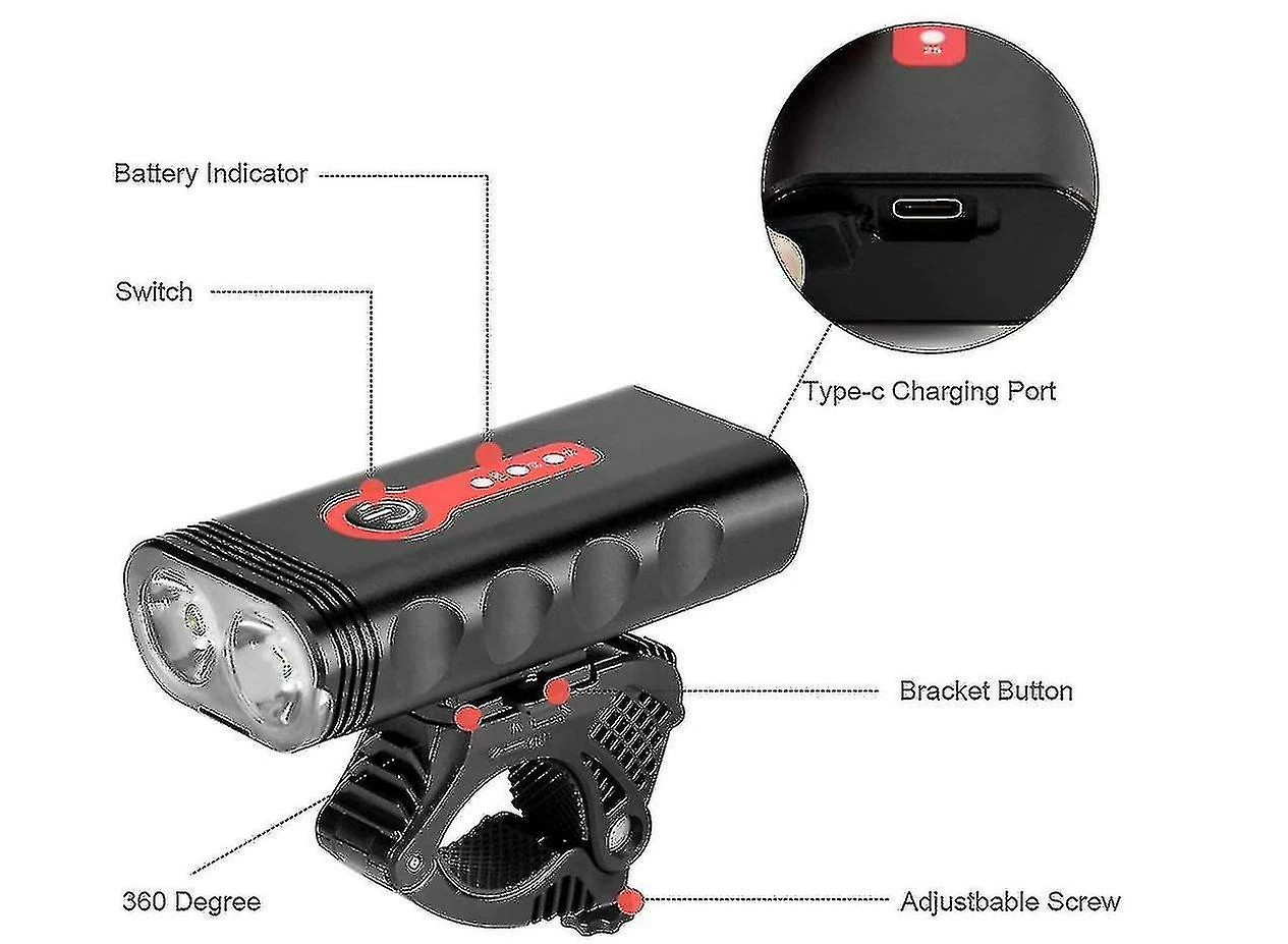 Type-C Rechargeable et suivi de puissance: 3 heures d’autonomie de la batterie en mode surbrillance, temps de veille jusqu’à 24 heures; Avec l’indicateur intelligent, gardez une trace de la puissance des lumières.4 Modes d’éclairage: Avec 4 modes d’éclairage différents de la lumière avant (lumière élevée / lumière moyenne / faible lumière / clignotement rapide) pour votre choix. De plus, la lumière offre le mode SOS pour prévenir les accidents à l’extérieur. Perles de lampe LED à double noyau: La lumière de vélo USB se compose de deux lampes LED-T6 avec une luminosité de 2400 lumens; Le système de faisceau à double distance produit des lumières larges et plates dans une gamme de 120 (Distance maximale du faisceau: 300 mètres) pour éclairer votre route sombre. Ajout d’un couvercle de protection de tête de lampe. Support facile à installer et réglable: les lumières de vélo conviennent aux poignées d’un diamètre de 20-32MM (0.79in-1.26in), support pivotant à 360 degrés pour un réglage libre de l’angle des phares. IP65 étanche et fonction Muti: IP65 étanche empêche les éclaboussures sous n’importe quel angle. Utilisé pour le cyclisme, la randonnée, la course, le camping ou d’autres activités de plein air, il peut également être une lumière d’urgence sûre.