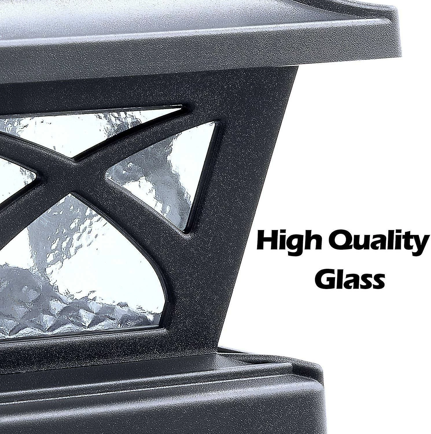 Quantity: 2 pieces Color: Black Housing Feature: Long Life: The lamp can work for 30,000 hours at high brightness without any replacement. Durable Material: Made of high quality glass with black powder coat finish, the color will not fade over time. Special Design: The perfect combination of style and durability for bring a unique and eye-catching look to your site. EASY INSTALLATION: No mess of wires, no outlets, suitable for DIY installation. Energy saving: solar powered, LED light source, no strobe light, no UV light or heat. Fully waterproof: the frame stands up in the rain and snow. Outdoor Solar Lights—Powered by solar energy, charge for 6-8 hours in direct sunlight, lights will automatically turn on for 8-10 hours at dusk and turn off at dawn. Made of high quality glass and plastic, durable and waterproof. Two Color Modes — The outdoor solar light has two modes (warm white and cool white). Textured pebble glass and sturdy plastic frame make them look great on a post at night, making your home and garden more attractive. FLEXIBLE — Solar post cap light can be easily mounted onto any standard 4×4 5×5 6×6 inch wooden post using the screws provided. Let your posts light up your outdoor spaces such as posts, decks, patios, fences, etc. You can also choose to mount it on outdoor tables and other flat surfaces exposed to direct sunlight. Weatherproof — It has an IP44 waterproof construction, a durable glass that makes it able to withstand all types of weather conditions and features UV fade protection. You can use it in any outdoor environment without worrying about exposing them to heat, heavy rain and snow. Friendly Tips—Make sure the sunlight can be directly on the solar panel for at least 6-8 hours to fully charge the internal battery. In the winter, for best performance, be sure to clear any snow or debris from the solar panels. Due to the particularity of solar energy, the lighting time in winter will be shortened.