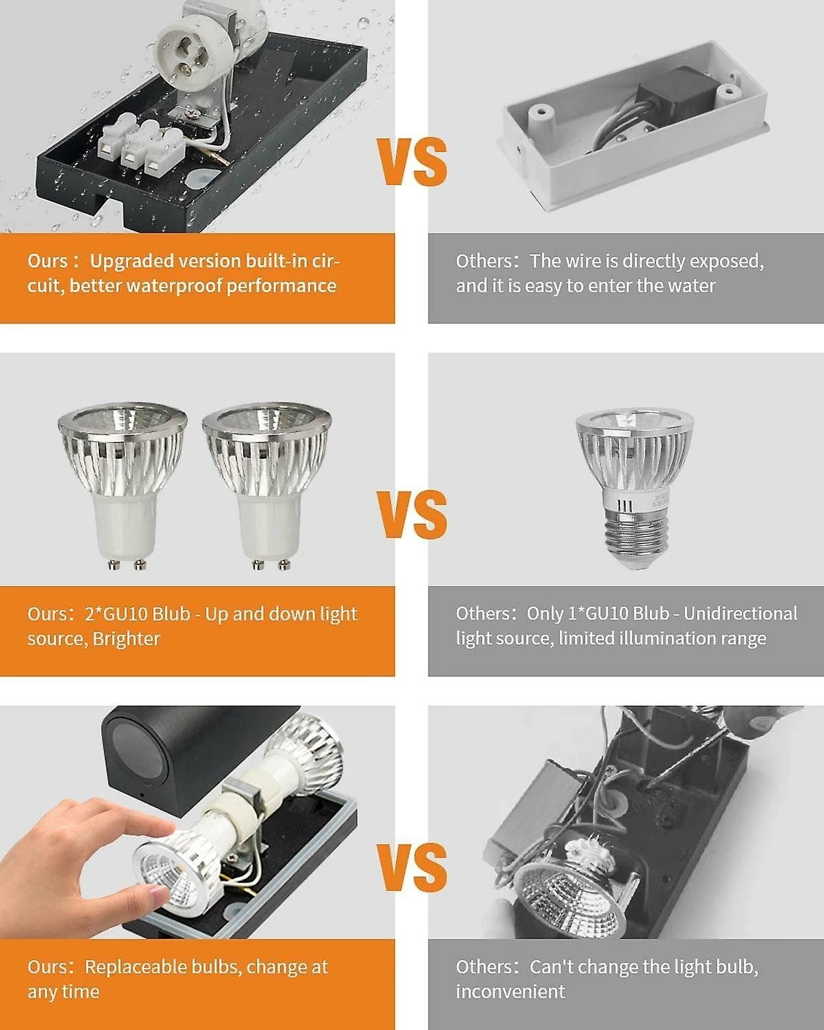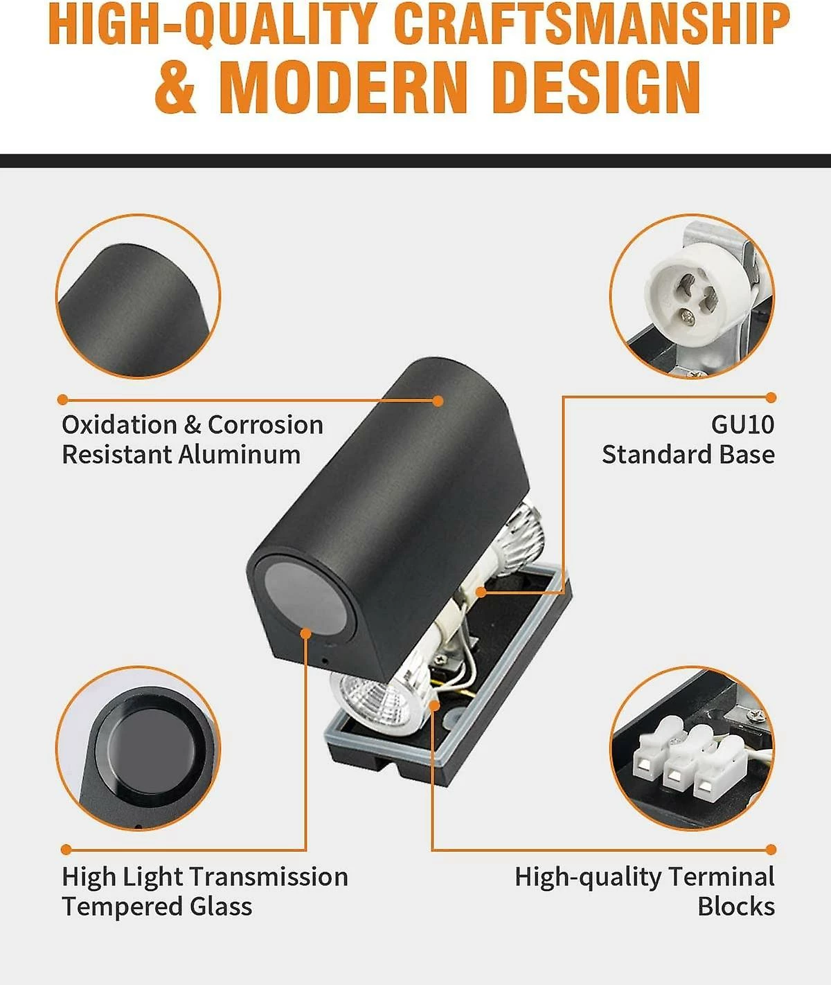 Make sure this fits by entering your model number.Modern Fantastic Designs: The outdoor wall sconce is designed with a flush flat back and a curved front, at the top and bottom is a tempered glass lens, when illuminated the light shines on the wall above and below. perfect for modern and industrial style homes.IP65 Waterproof Outdoor Lighting: The tough aluminium body and weatherproof material ensures it can handle all types of weather. Make outdoor wall lights mains powered suitable use for indoor and outdoor.Easy to Install & Replace Bulbs: Wall mounting with screws and connect the cable directly. Use allan key (include) to open wall lamp top and bottom caps, then install 2 x GU10 bulbs£¨not include£©,the maximum capacity is 35 watts. So easy