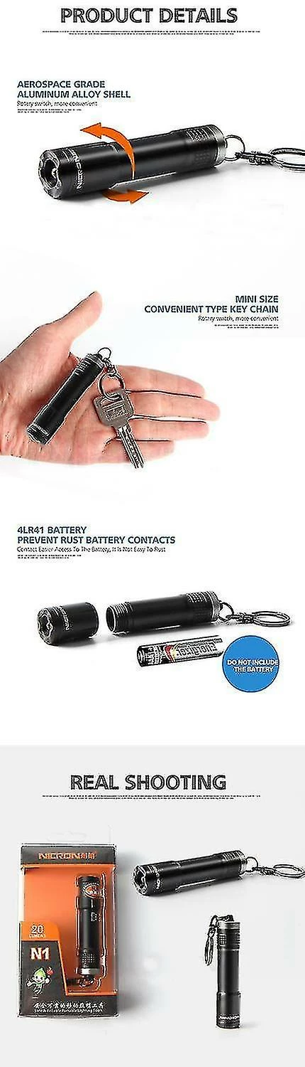 NICRON N1 AAA EDC Flashlight Mini KeyChain Light Waterproof LED Mini Torch Work Lamp Outdoor HuntingSpecification:BrandNICRONWaterproofIPX4BatteryAAA batteryLumen20lmSize71.5 x 15.5cm / 28.15 x 6.10inchWeight18gFeatures:High quality aluminum alloy.AAA battery.IPx4 waterproof.Package include:1 x Flashlight