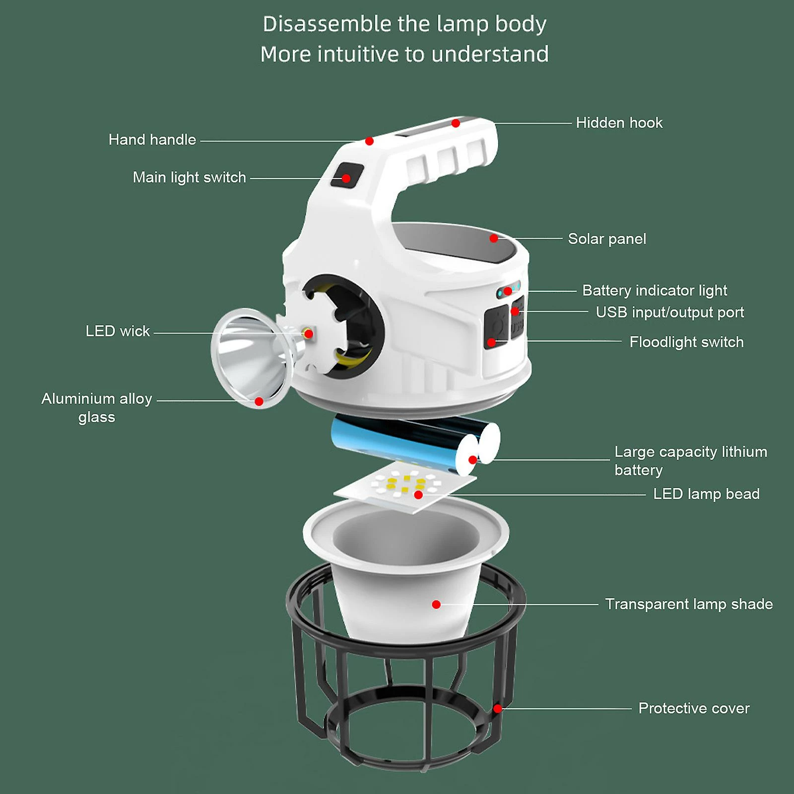Features:1. Super Bright LED Flashlight: This handheld camping light is great for camping, walking dogs, etc. Also useful as a spotlight when you are hiking in the wild. 2. Emergency Power Bank: Our rechargeable flashlight also serves as an Emergency Power Bank for your camera, GPS, mobile phone, etc. The rechargeable lantern can be used as an emergency power supply. 3. Lightweight And Waterproof: LED camping lantern is made of high-grade ABS + PC, and the integrated sealed structure makes it waterproof, super durable, and lightweight.4. Solar / USB Rechargeable: Our hanging flashlight equipped with USB charging port, can be charged without disassembling the battery, multiple charging methods, and power reminders allow you to know the status of the spotlight at any time. 5. Atmosphere Decoration: The tent lantern can be used as a mood light to regulate the festive atmosphere and is ideal for garden and party decorations, or as the reading light.Specification:Material: ABS + PC Product Color: White Product Size: 104 x 168mm Product Weight: 260g Light Color: White Light + Warm Light + Natural LightBattery: 2 x 18650 Lithium Battery, 2400mAhPackage Included:1 x Solar Camping Light