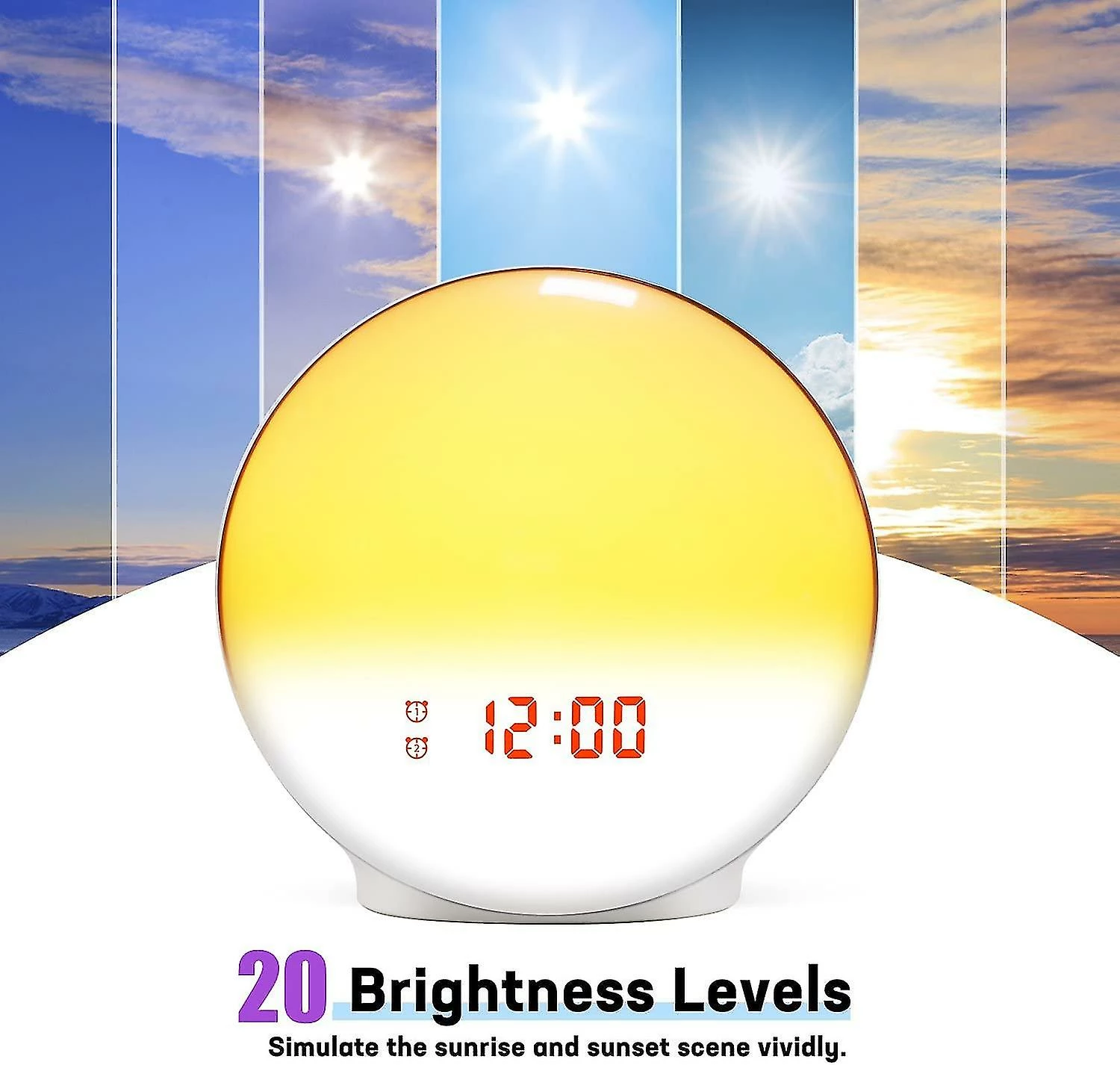 Sonnenaufgang-Simulationslicht Tageslichtwecker ist fr alle gedacht, insbesondere fr schwere Schlfer und Kinder.Das Sonnenaufgang- Simulationslicht mit 7 natrlichen Geruschen wird 30 Minuten vor der Alarmeinstellung schrittweise von 10 % Helligkeit auf 100 % eingeschaltet.