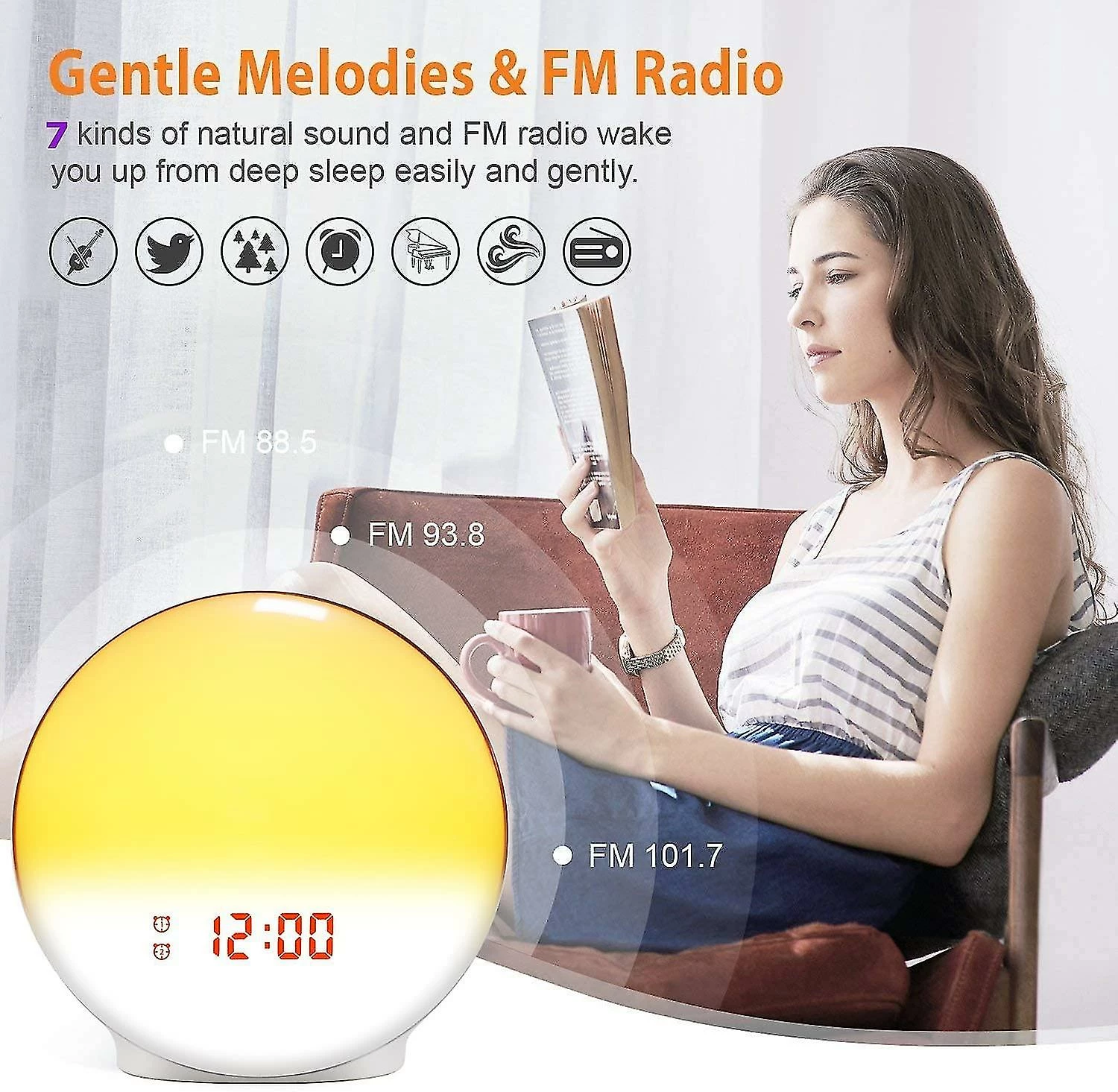 FM-Radio 7 Alarmtne Das wake up licht hat eine FM-Radio-Funktion und Sie mssen die Taste Radio drcken. Es ist erstaunlich,dass Sie 7 Alarmtne auswhlen knnen,um Sie aufzuwecken,16 Level Lautstrke einstellbar