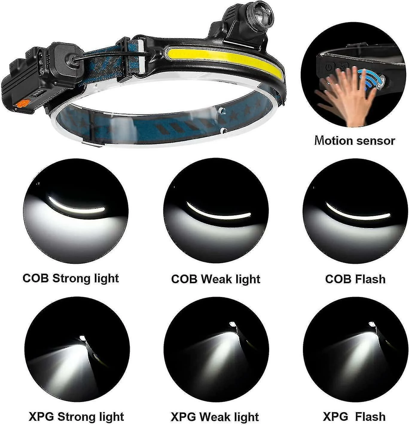 Zone d’éclairage large 270 Head Torch RechargeableLa torche de tête utilise un nouveau design Puissant XPG + COB LED avec 270 grand angle d’éclairage, éclairant toute la zone. C’est l’ajout parfait à votre équipement de jogging, de camping, de pêche, de randonnée, de randonnée ou de chasse.6 Modes d’éclairage PHARE LEDLe phare à LED COB dispose de 6 modes d’éclairage et est facile à utiliser. Lumière LED XPE: lumière forte / lumière faible / flash, lumière COB: lumière forte / lumière faible / flash. Lorsque vous allumez la lampe frontale de camping2000mAh Batteries rechargeables intégréesLa lampe de poche de la lampe de poche a une batterie au lithium rechargeable intégrée de 2000mAh, lampe de poche de phare rechargeable équipée d’un port d’entrée de type C amélioré pour une expérience de charge plus rapide (câble de charge USB de type C inclus)La fonction de charge permet non seulement d’économiser le coût de remplacement des batteries, mais peut être recyclée. Une bande de tête durable, réglable et lavable offre un ajustement confortable et un look superbe. Motion Sensor LED Head TorchCette torche à tête LED dispose d’une batterie de capteur de mouvement de haute qualité. Lorsque l’interrupteur de la fonction du capteur est allumé, vous pouvez allumer / éteindre la lumière en agitant simplement votre main dans la plage de fonctions du capteur. Quand et n’importe où, l’interrupteur des phares de barre lumineuse peut vous apporter de la commodité, que vous soyez en randonnée, en camping ou en alpinisme. CaractéristiquesWick : XPG + COBMatériau : ABS u0026 SiliconelUMEN : COB 1000LM + XPG 500LMBatterie : 3.7V 2000mah (intégré)Le paquet comprend: 1 * Torche de tête LED1 * Câble USB1 * Bande réglable1 * Manuel de l’utilisateur anglais