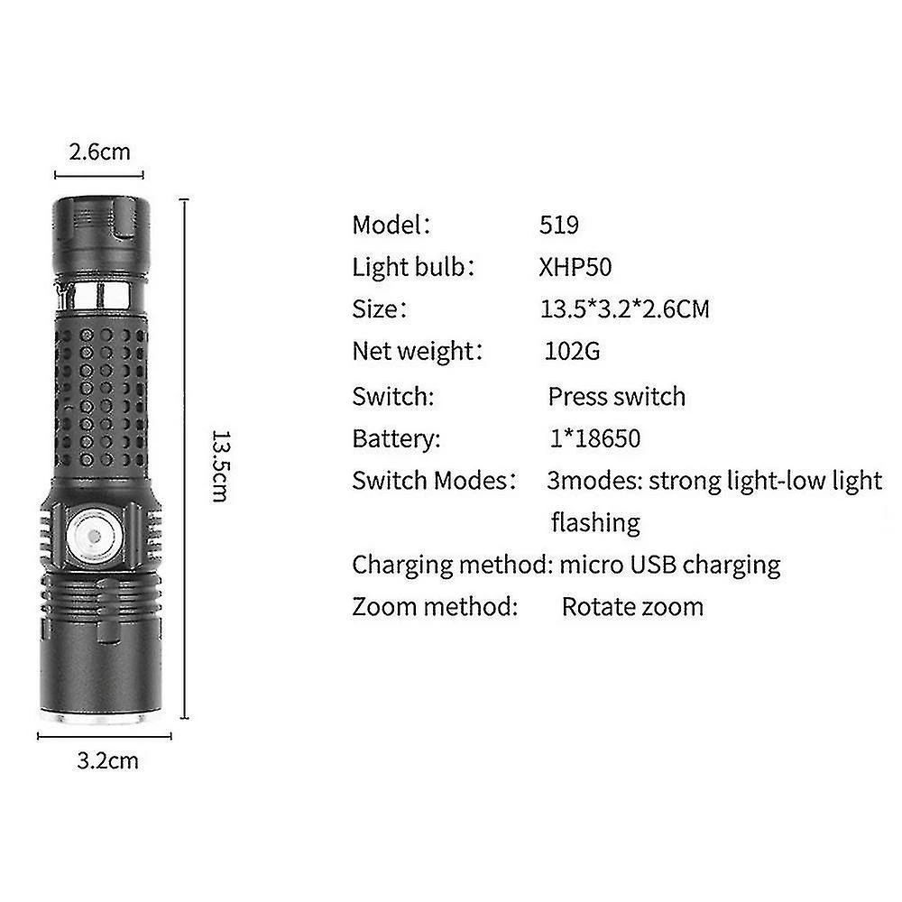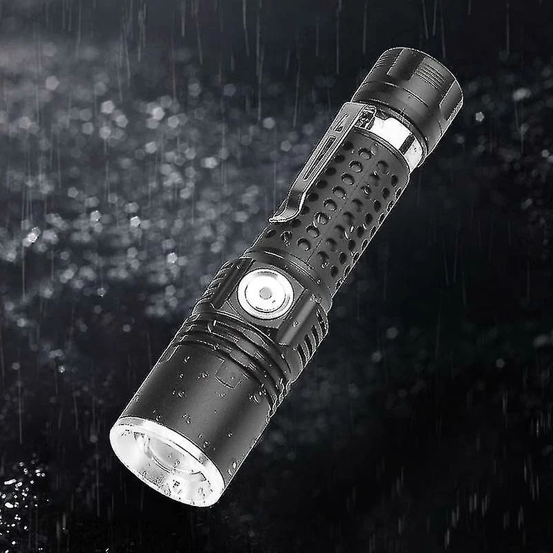Lumen: 600-800 lumens Features: with pen clip, low battery reminder, compact and portable, rotating zoom, non-slip silicone sleeve. Waterproof Level: IPX4