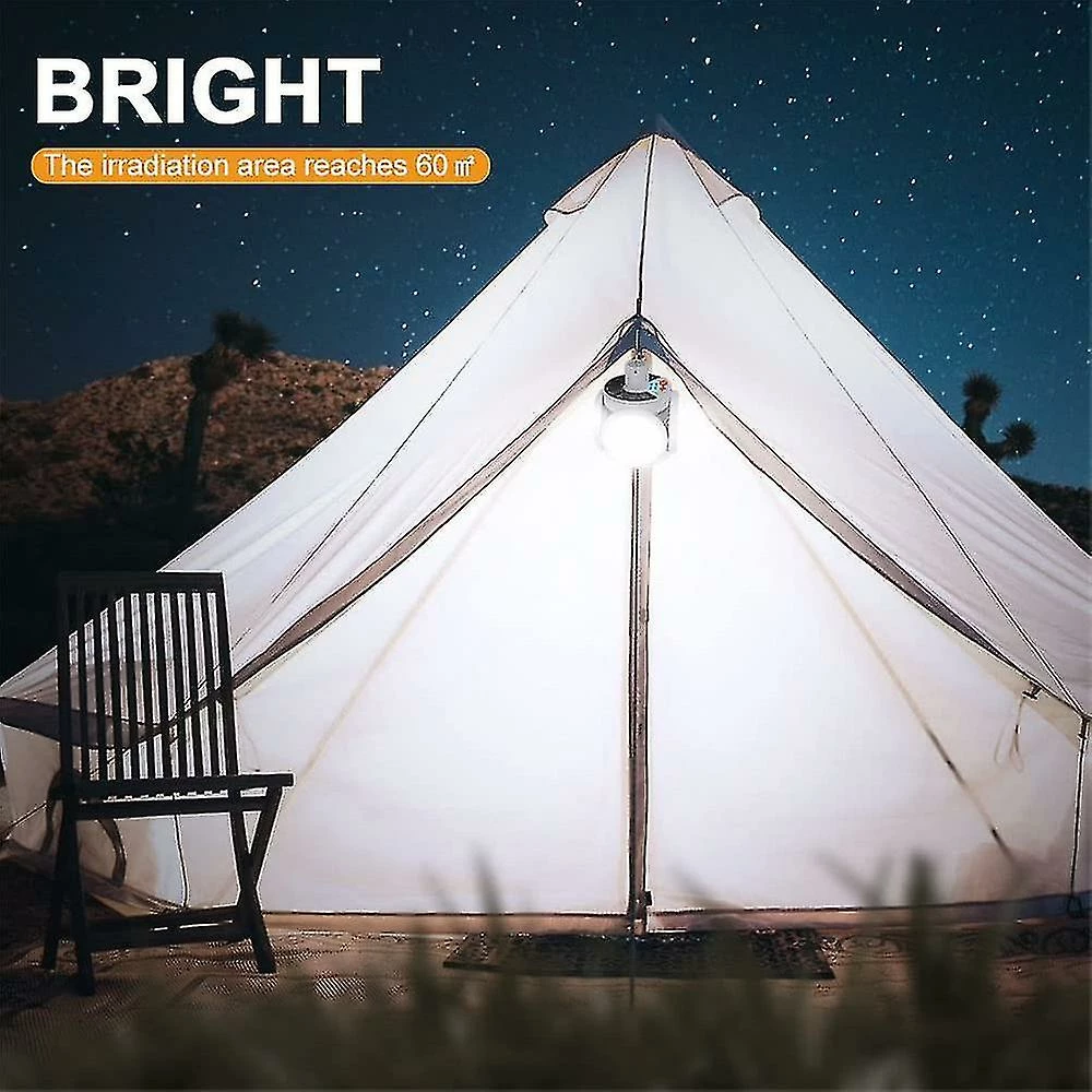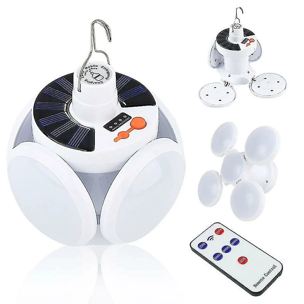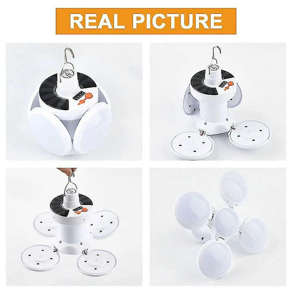 Solar and USB Rechargeable Camping Light: This solar camping light can charge itself by solar panel or USB cable . 4 indicator lights show you the power levels 25% 50% 75% 100%. Ideal for camping trips fishing car maintenance dealer events tailgate parties or outdoor activities. Foldable LED Soccer Ball Lamp with More Angles: These solar camping lanterns adopt the new soccer shape design with foldable light bulb panels adjustable LED parts arbitrary rotation angle humanized design 90 automatic folding power display and real-time monitoring of power consumption new soccer shape design. Raise all four light panels to enjoy 360 degree all-round illumination. Emergency Survival Kit: Powerful tent lantern that allows for an SOS signal in emergency situations. Waterproof Durable: The camping lantern made of high quality ABS material firm and durable structure with good fall resistance. The Light allows for convenient use in heavy rain or snow. Widely used for BBQ Gazebo BBQ Shelter Glamping Hiking Picnic Campsite Emergency Preparedness and more. Wide Application: This rechargeable lantern emits up to 2500 lumens* in high mode providing lighting for LED garage LED bulbs workshop workbench barn warehouse basement camping outdoor office home tent car barn high light transmission PC lampshade factories home furnishings projects etc. Specification Size:12*13.7CM Lighting time: 8-36H Endurance time: Charge for more than 8 hours during the day Material:ABS plastic + electronic components Packing include: 1Pcs * Camping Bulb Note: Besides different computers display colors differently the color of the actual item may vary slightly from the images thanks for your understanding